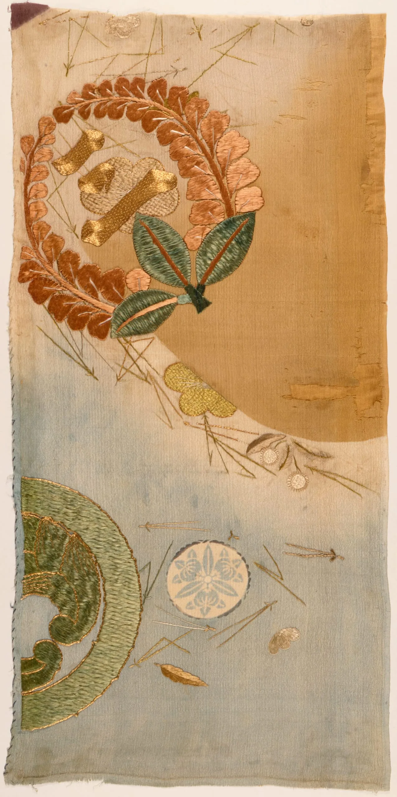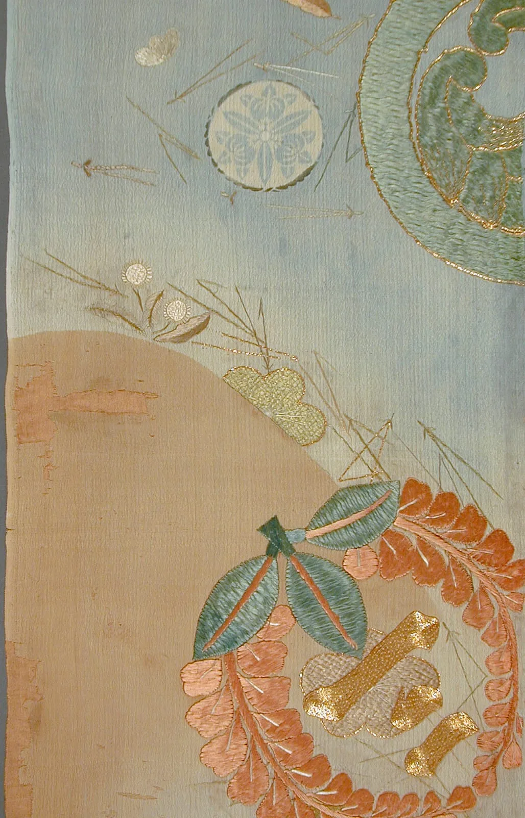- Silk plain weave (crepe; chirimen), brush-dyed (hikizome), silk, gilt paper wrapped silk thread, and gillt paper embroidery, paste-resist dyed (noribosen)