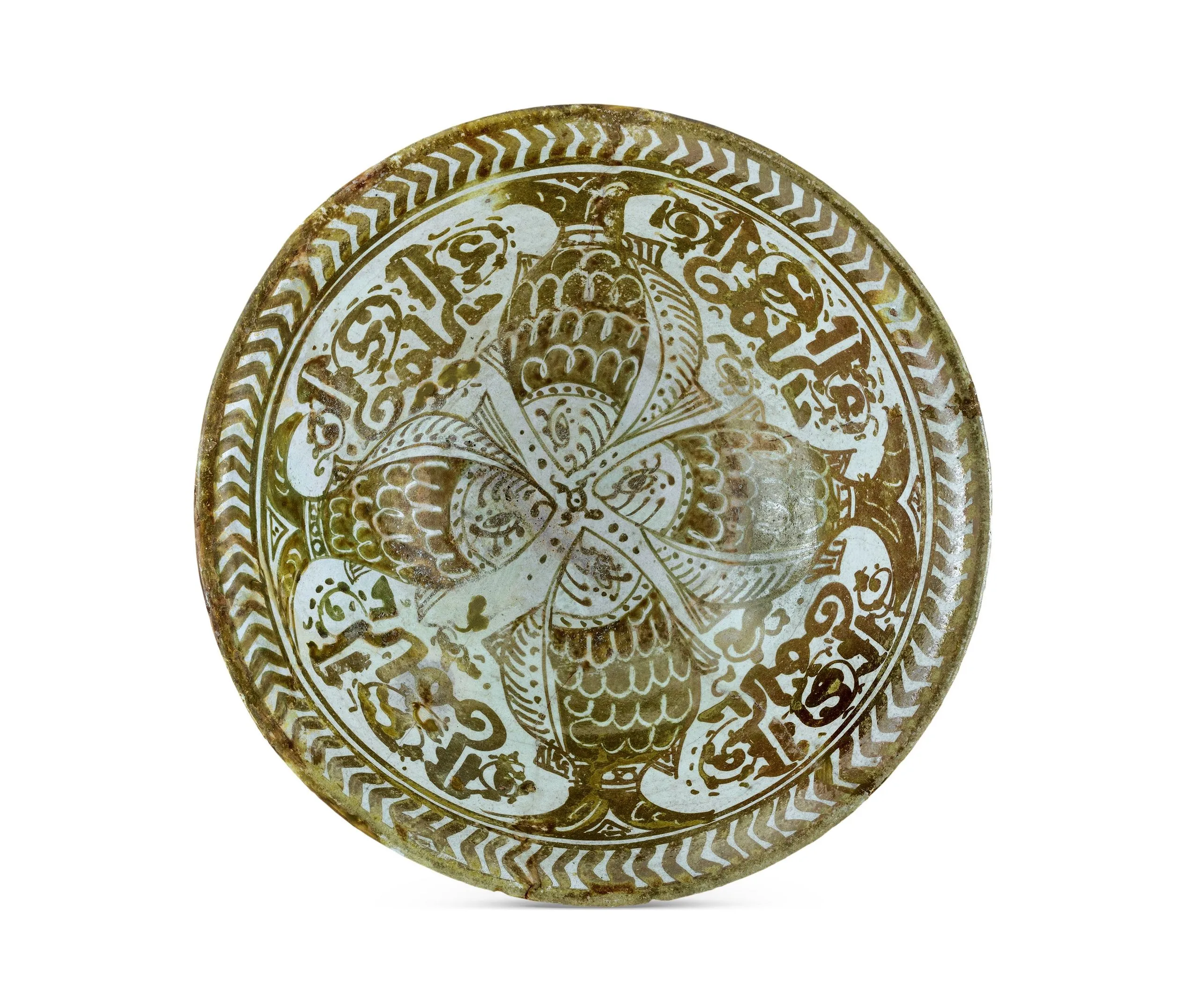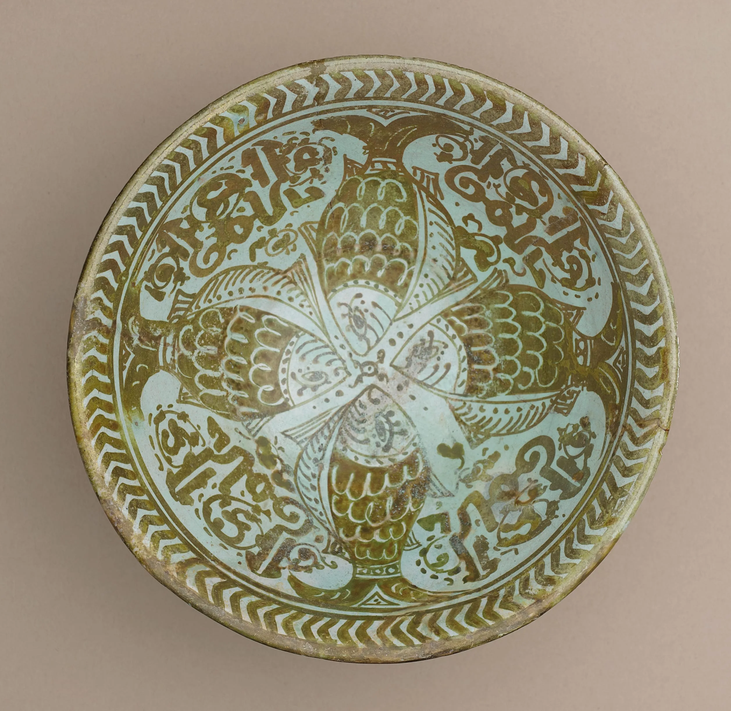 The art of luster-painted ceramics was likely introduced in Egypt at least by the early eleventh century under the Fatimid dynasty. Fatimid lusterware is typically decorated with figures, both human and animal, as can be seen in this bowl with four golden fish alternating with an inscription repeating the Arabic word for prosperity, on an opaque turquoise-glazed ground.