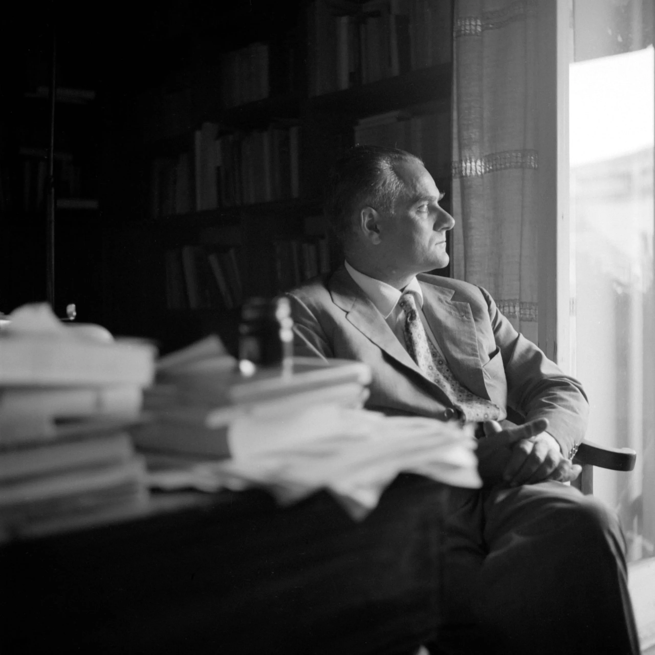 Black and white photograph of a white man in a suit seated in profile near a bright window, with stacks of papers in the foreground and a bookcase behind
