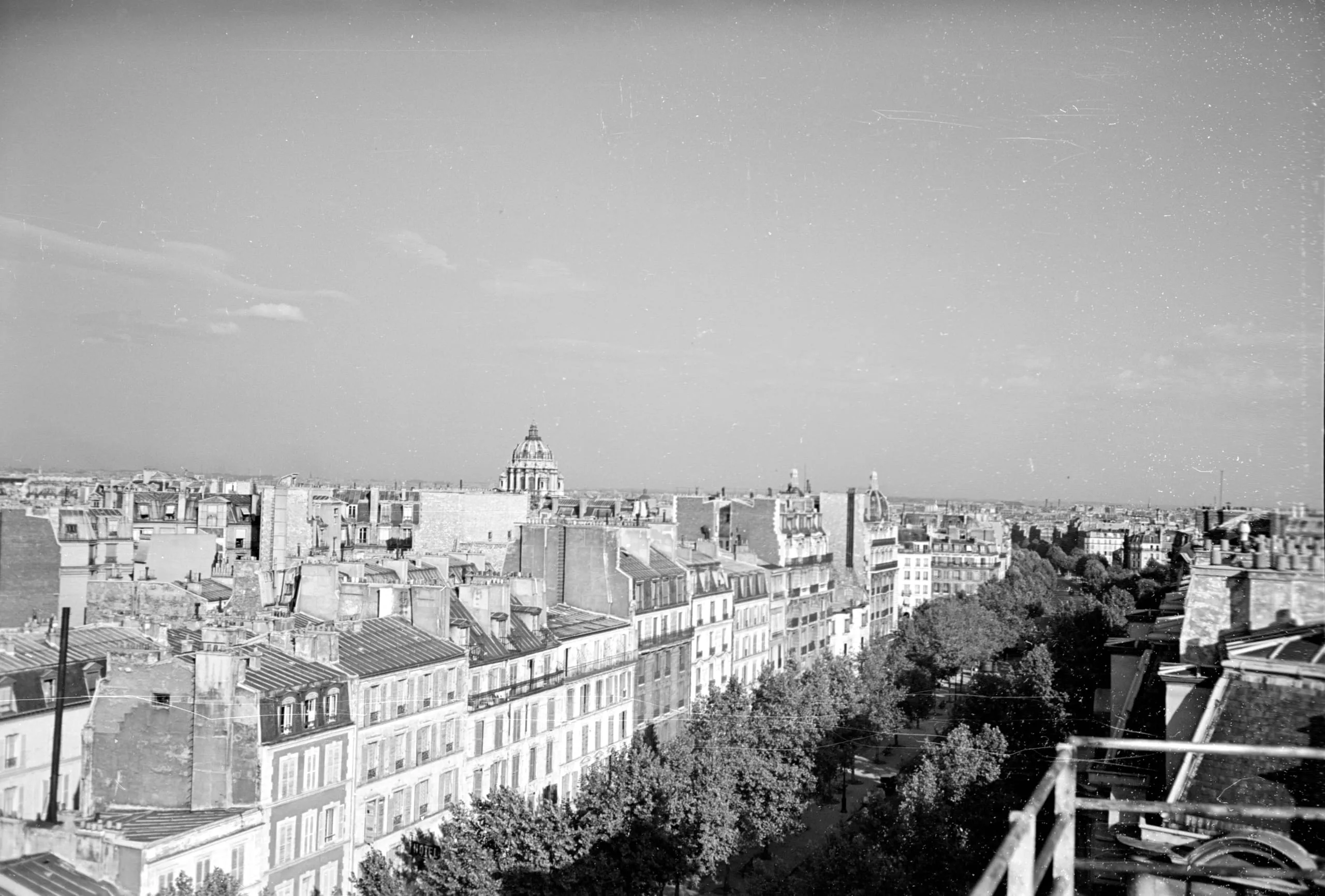 Black and white photograph of a dense urban rooftop panorama with a tree-lined boulevard, Haussmann-style buildings, and a domed structure rising above the skyline