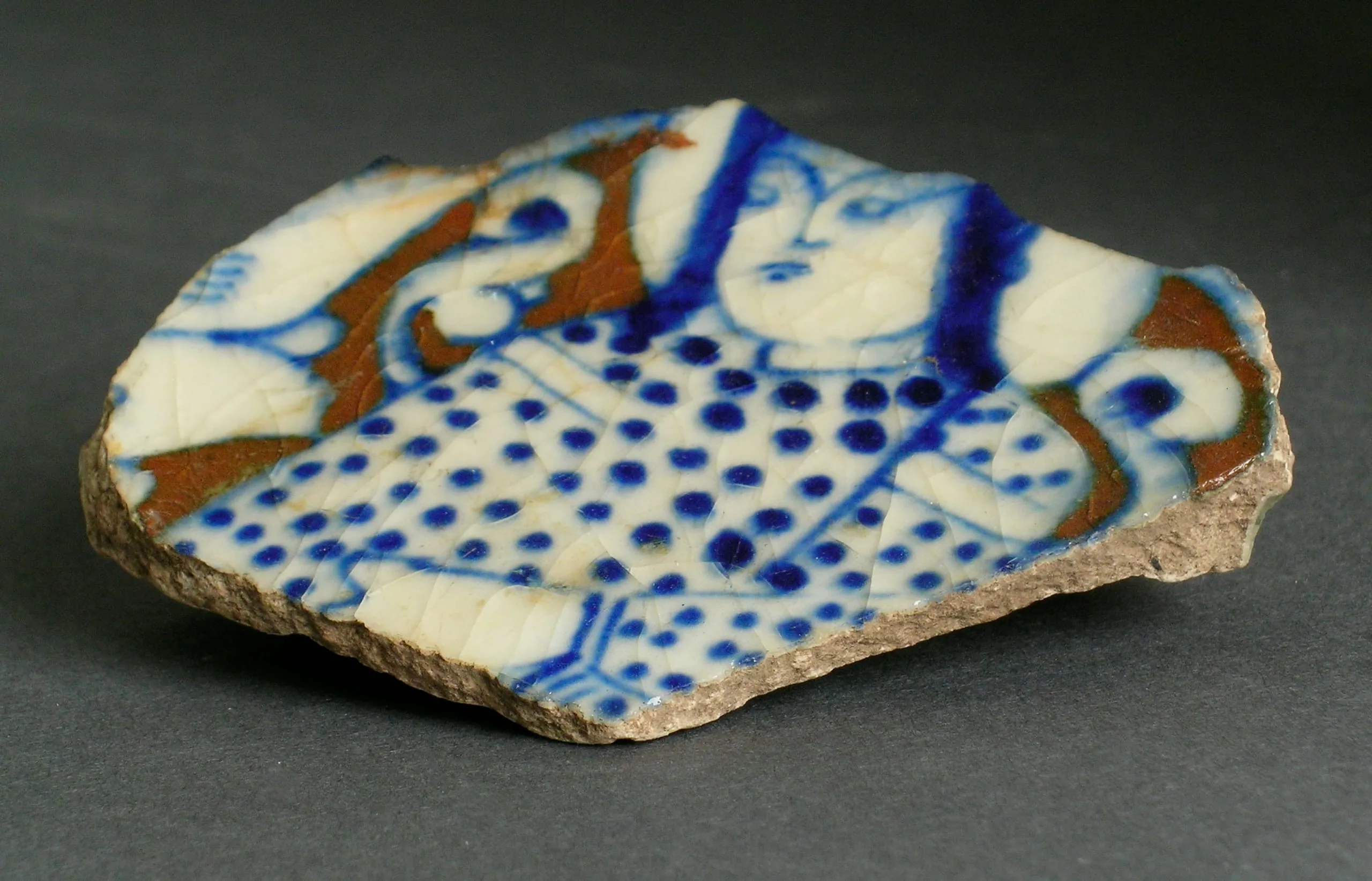 - Fritware, underglaze slip (?)-and stain-painted