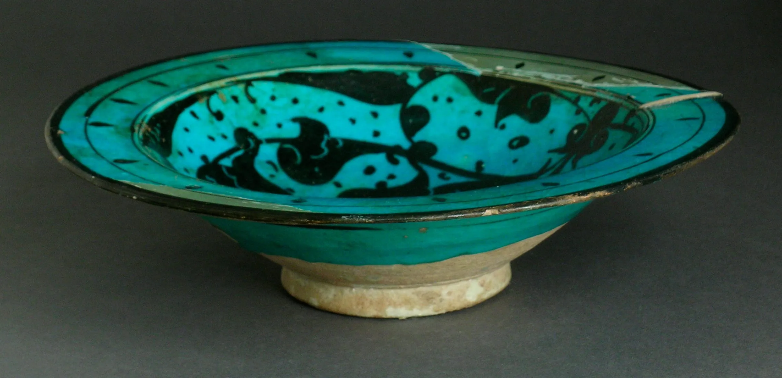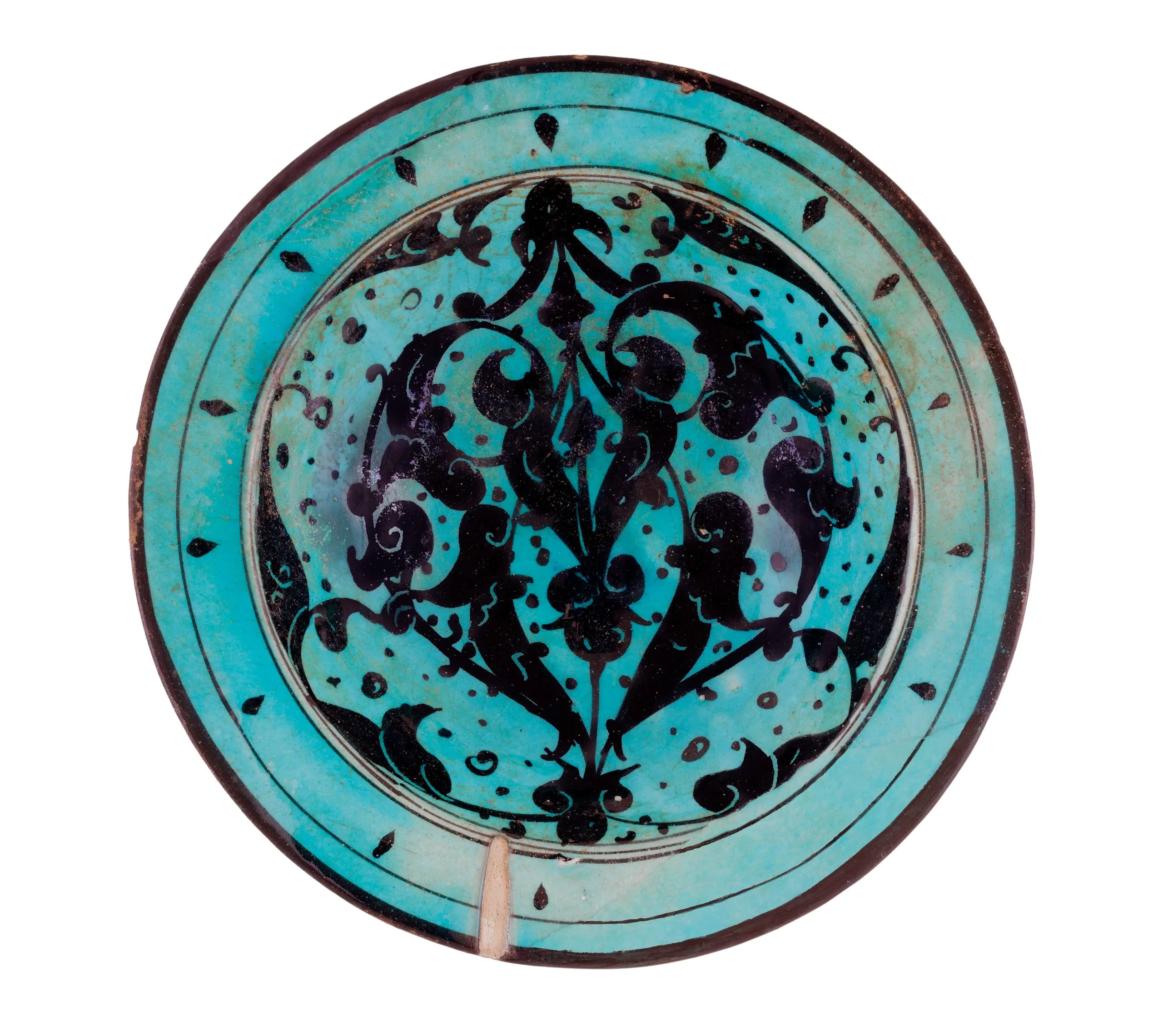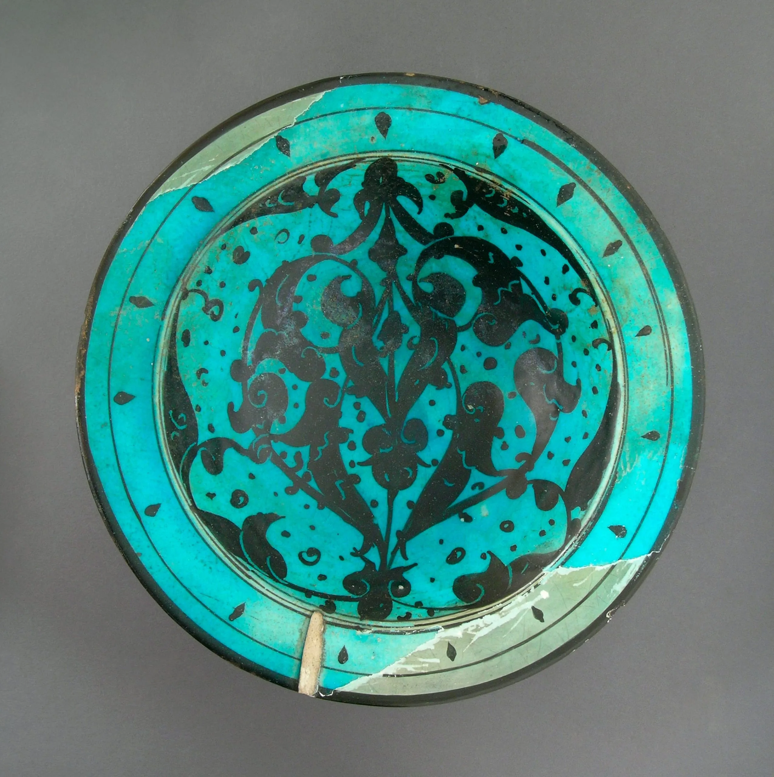 This handsome turquoise and black bowl belongs to a type of ceramic commonly known as Raqqa ware. In the nineteenth century the Syrian city of Raqqa became a source of fascination for Europeans who read about it and its famous king, Harun al-Rashid, in The Thousand and One Nights, sparking a demand for ceramics from the site that in turn led a number of dealers to misattribute the provenance of their wares. New research has shown that Raqqa was not the exclusive source for such wares. In fact they were produced elsewhere in Syria as well as in Anatolia and Egypt.
