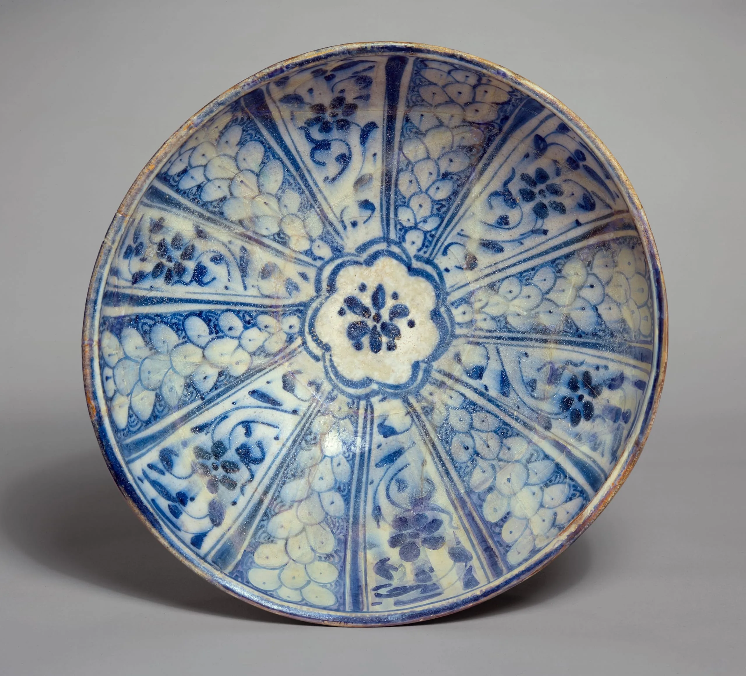 This is one of three nearly identical bowls in LACMA’s collection, something of a rarity in Islamic ceramics, indicating that they were made in the same potter’s workshop and suggesting that they may have been intended as part of a matched set (see M.2002.1.65 and M.2002.1.67). They were likely produced under the Mamluk dynasty, which ruled Egypt and Syria from 1250 to 1517. Their blue and white color scheme and scrolling leaf and floral designs are typical of late Mamluk ceramics, both tableware and architectural revetment (see M.2002.1.50).