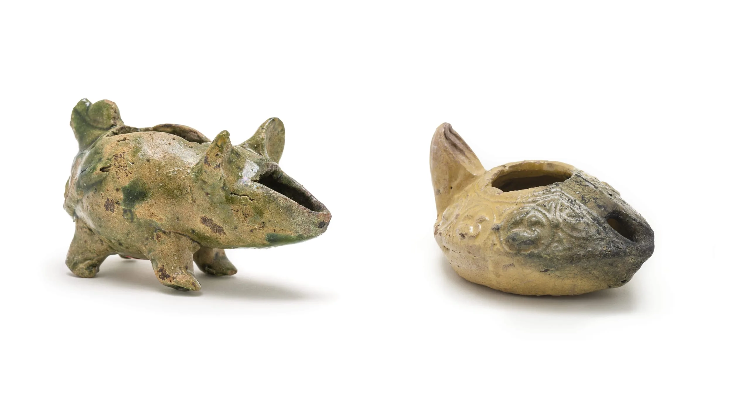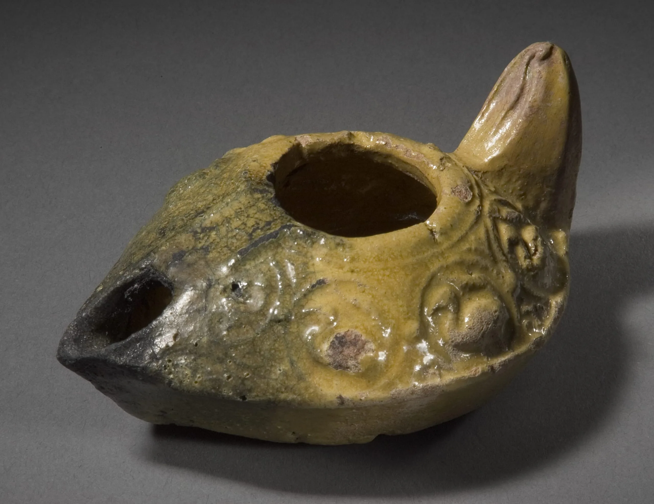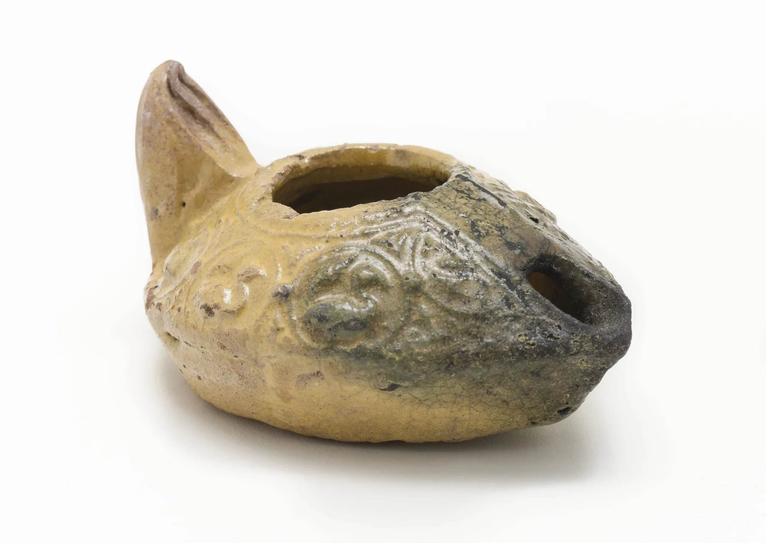 Clay provided a cheap and easy means for mass-producing small oil lamps, and numerous examples survive from the late Roman period onward. Unlike many unglazed lamps of the same shape, this petite example, decorated with tiny roundels enclosing ducks or swans, is further embellished with a yellow glaze that approximates gold, elevating the humble clay material.