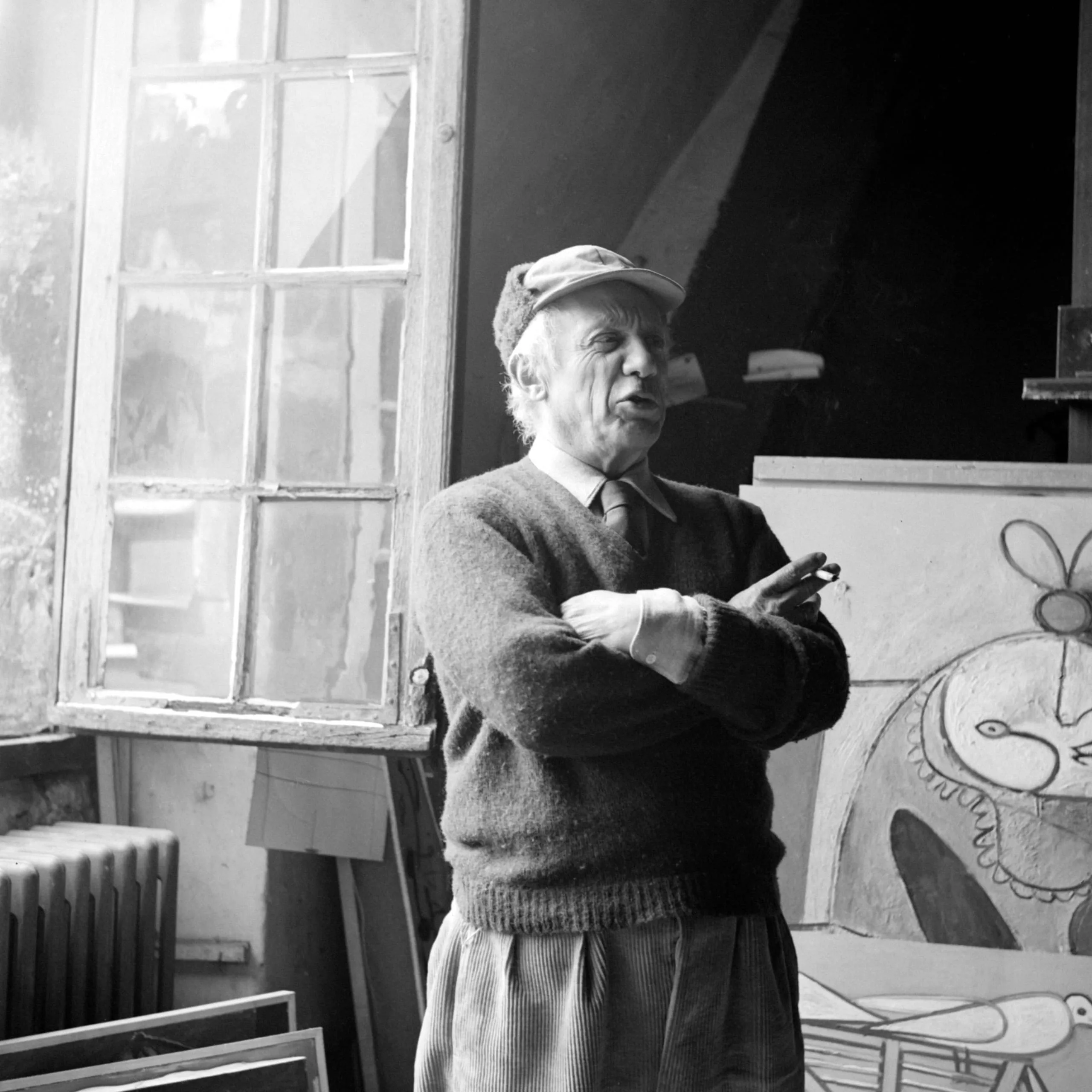 Black and white photograph of an older white man in a flat cap and dark sweater, arms crossed, standing in an artist's studio beside a large canvas with line drawings