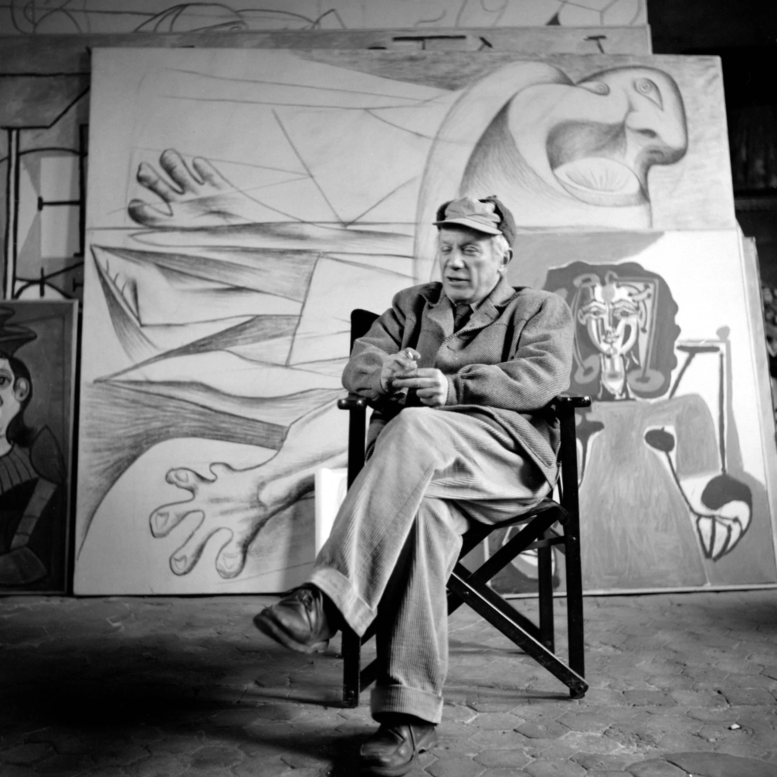 Black and white photograph of an older man in a cap and loose jacket seated in a folding chair, surrounded by large abstract canvases in a studio