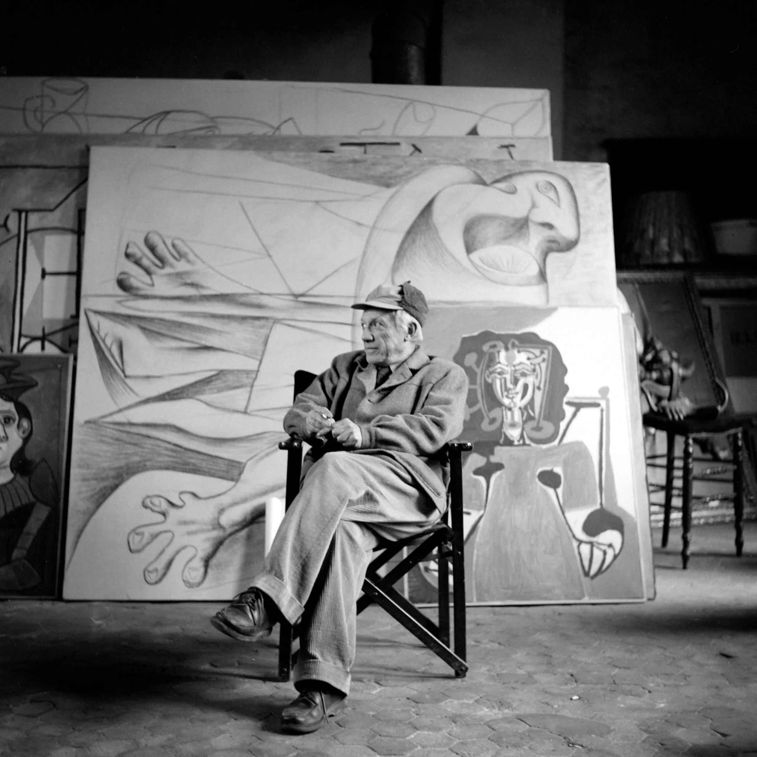 Black and white photograph of an older man in a flat cap and loose jacket seated in a director's chair, surrounded by large abstract canvases in an artist's studio