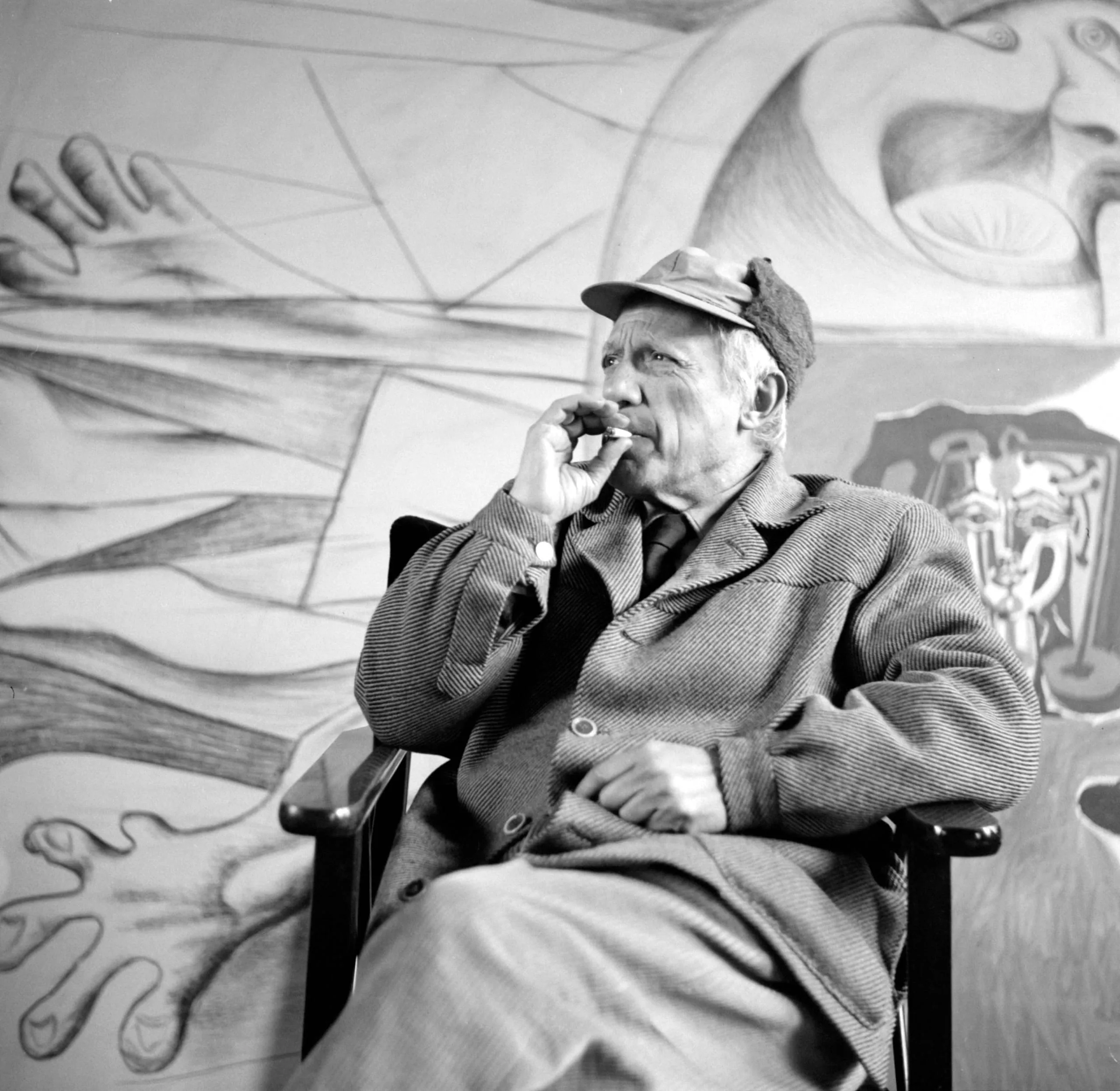 Black and white photograph of a seated older white man in a flat cap and heavy overcoat, holding a cigarette to his lips, in front of a large Cubist-style mural