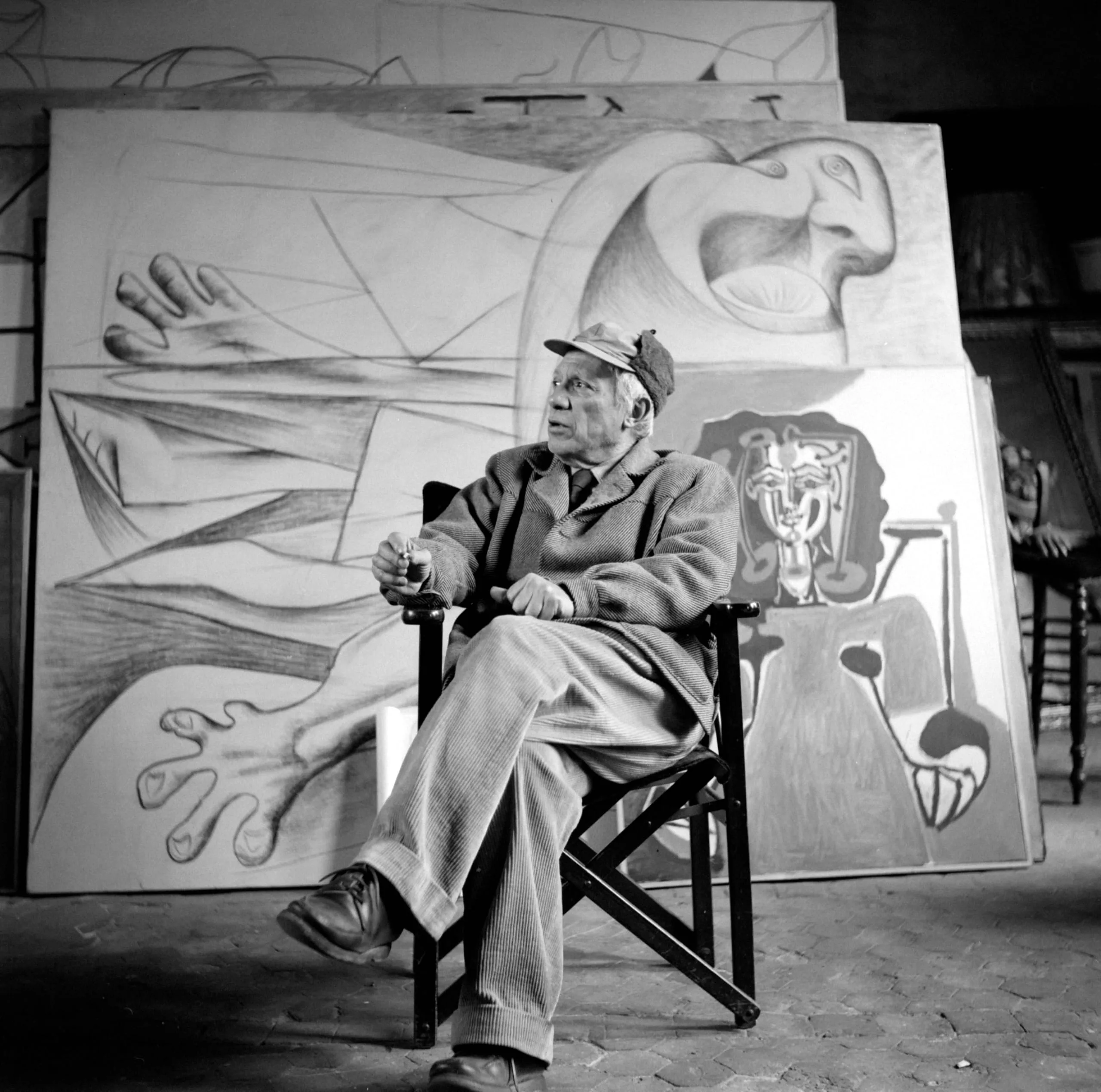 Black and white photograph of an older white man in a flat cap and corduroy trousers seated in a director's chair in a studio, surrounded by large abstract canvases