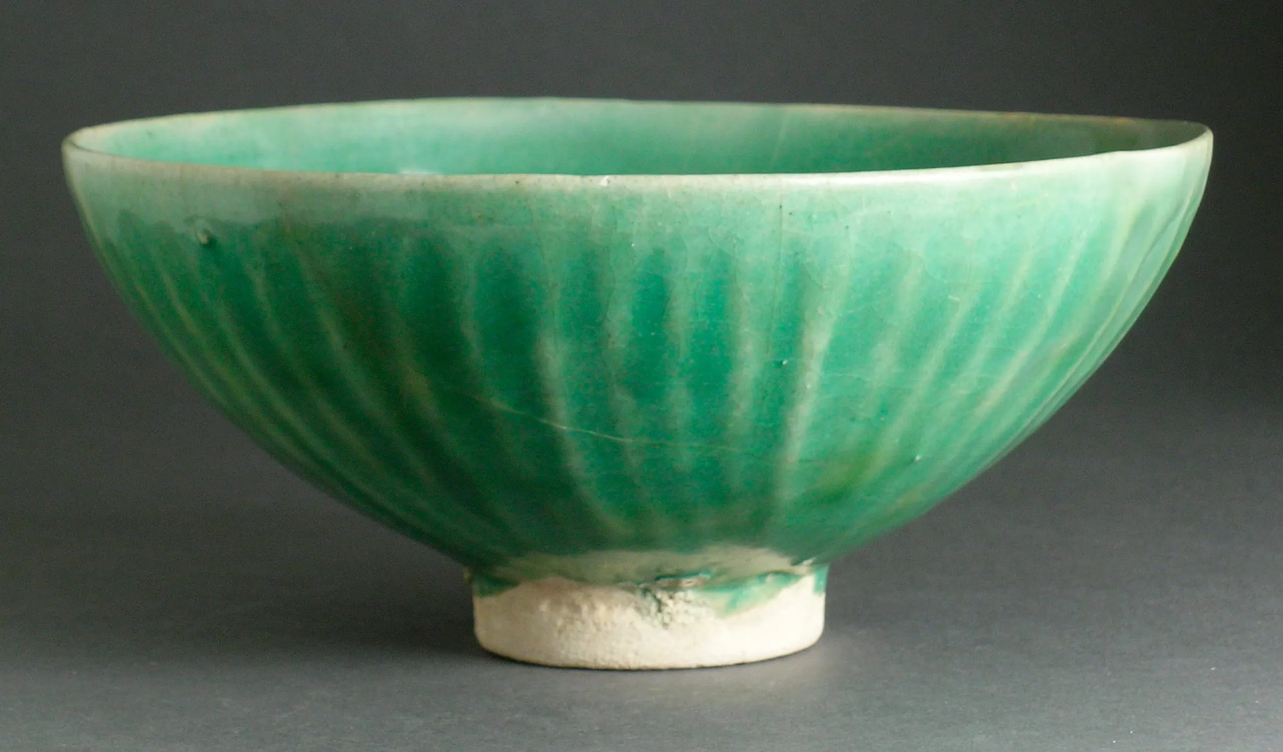 Ceramic bowl with rounded body, small foot ring, and vertical ribbing covered in a variegated emerald-to-seafoam green glaze