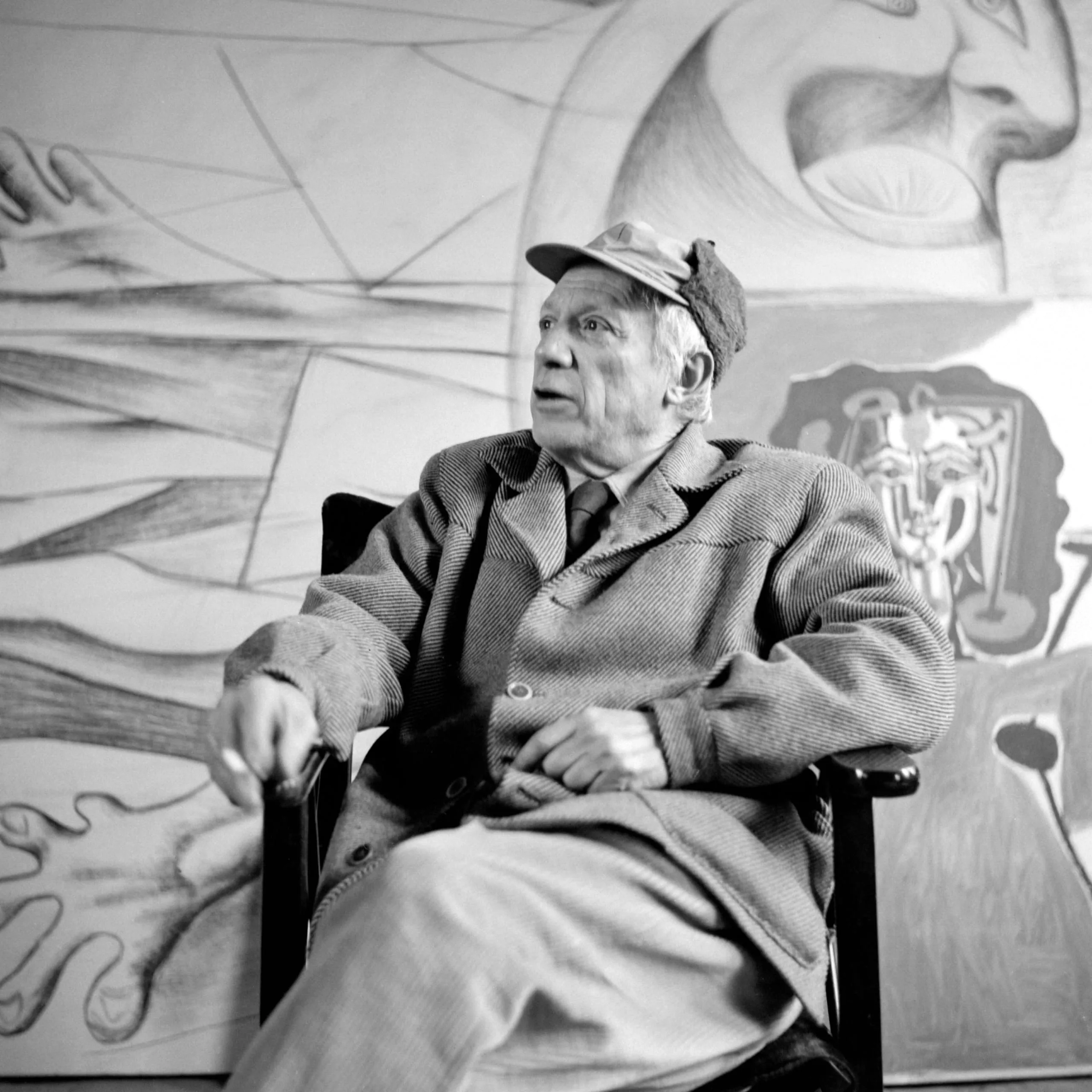 Black and white photograph, an elderly man in a flat cap and corduroy overcoat seated in a chair, large-scale abstract paintings visible behind him