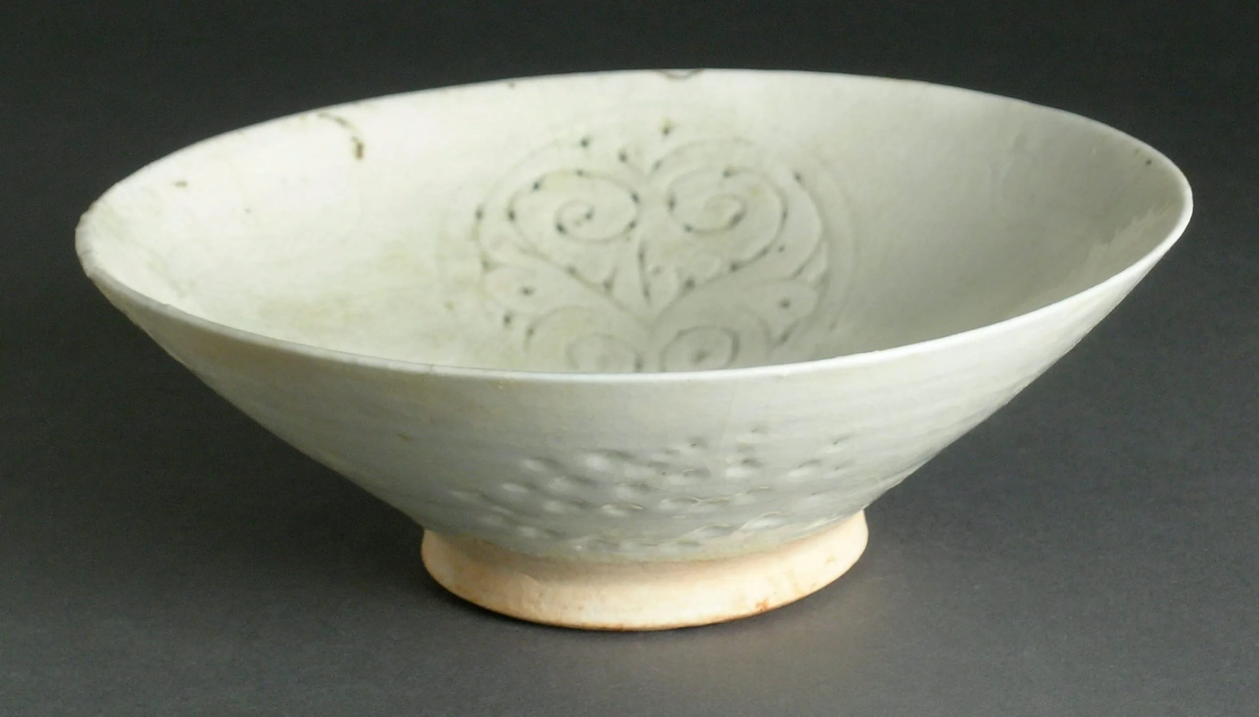 Ceramic bowl with pale celadon glaze, conical form on a low foot ring, interior carved with scrolling foliate design, exterior with relief scale pattern