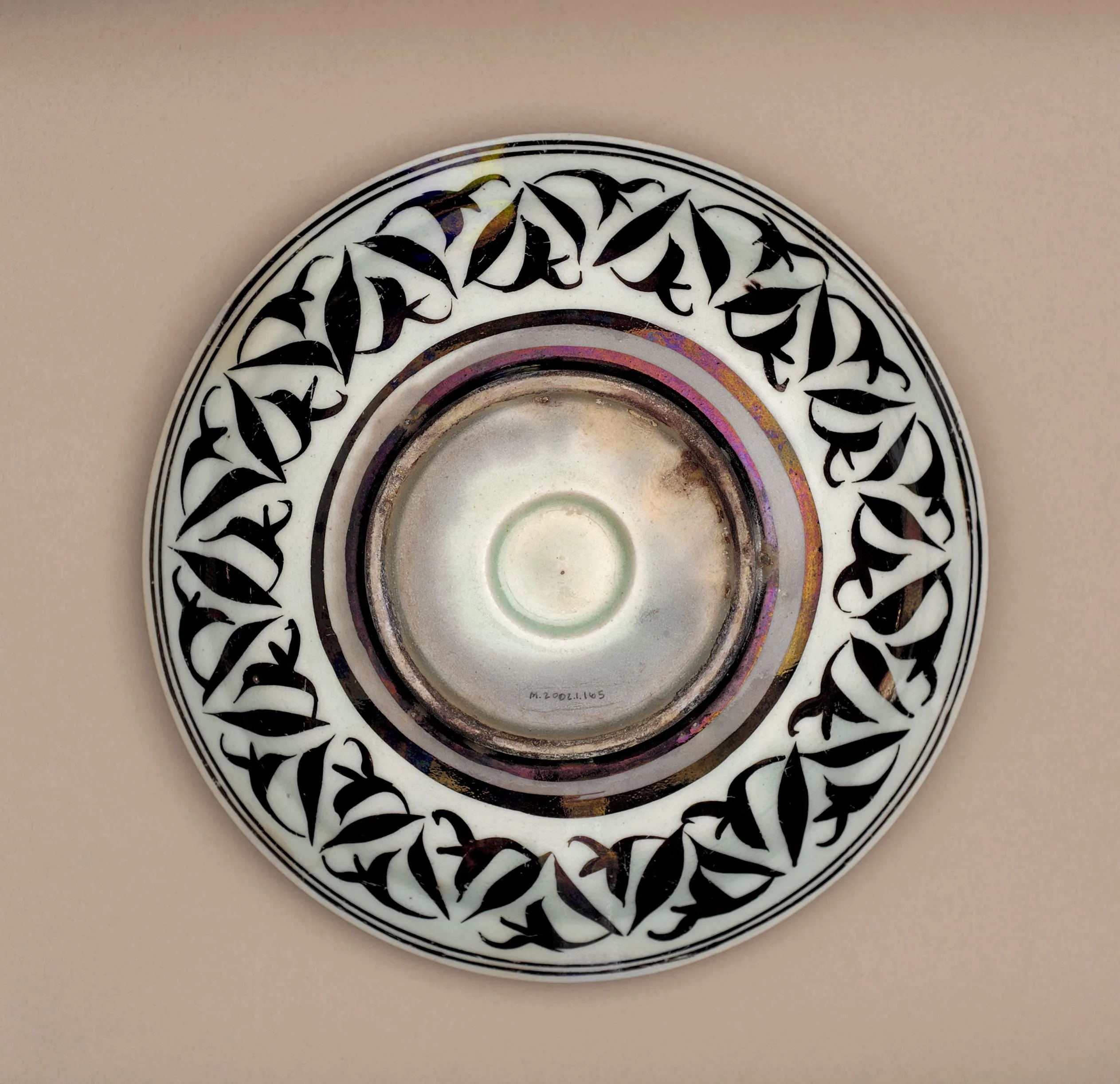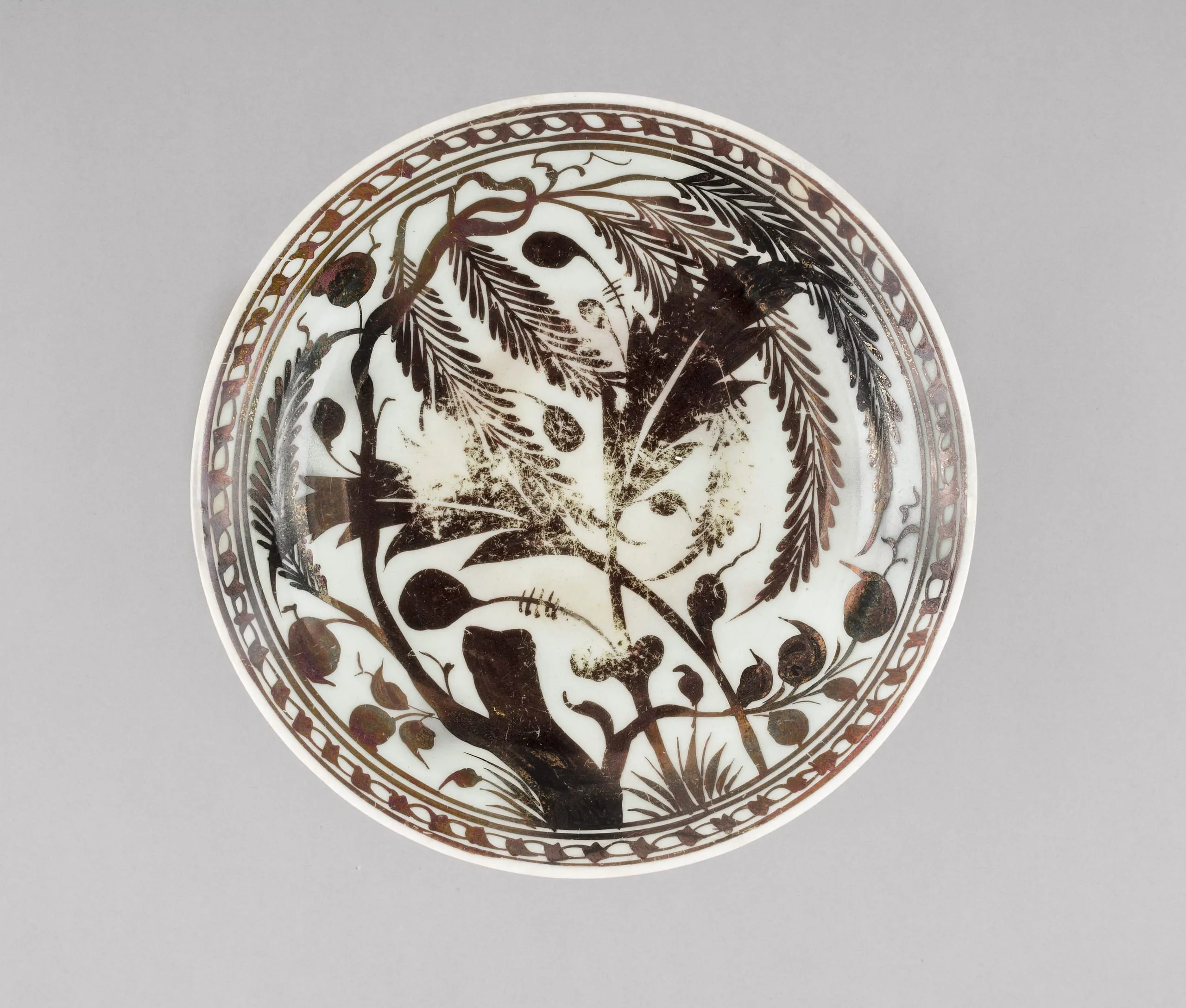 Unlike much of the pottery of seventeenth century Iran, in which Chinese-inspired decoration predominates, the lusterwares of this period avoided Far Eastern designs. Most of these objects—all vessels—are relatively small in scale by comparison with earlier periods. They generally bear densely rendered floral designs and brief landscape vignettes with spiky-leafed trees and occasionally birds and animals, as in this shallow dish whose coppery luster decoration is dominated by a spiky-leafed tree perfectly configured to echo the vessel’s circular form.