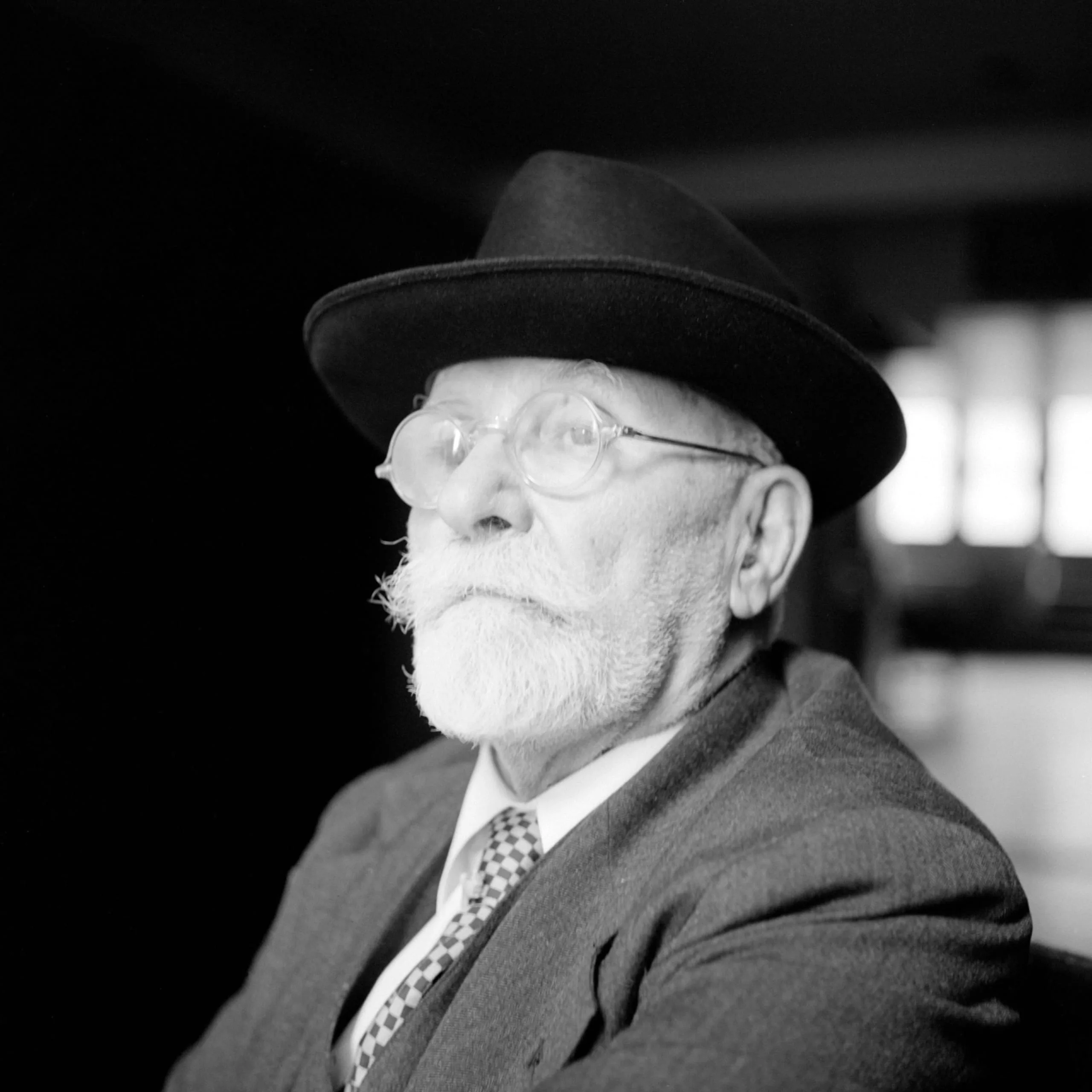Black and white portrait photograph of an older white man in profile, wearing a dark fedora, round wire-rimmed glasses, and a checkered tie, lit from the left against a dark background