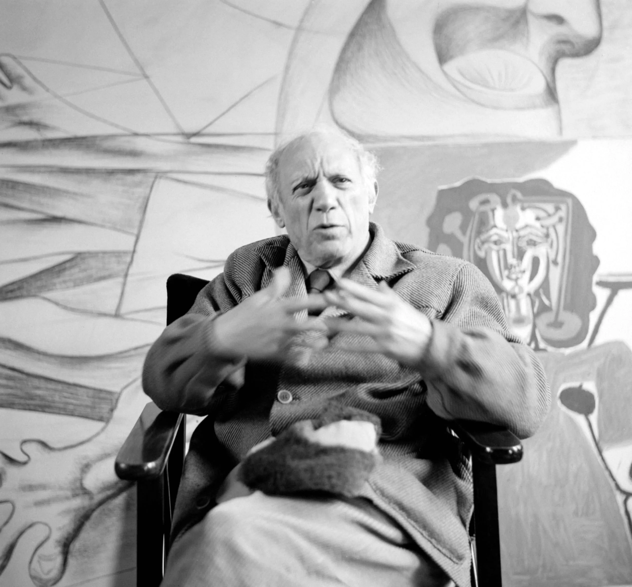 Black and white photograph of an elderly white man seated in a wooden chair, hands raised in motion blur, large abstract mural visible behind him