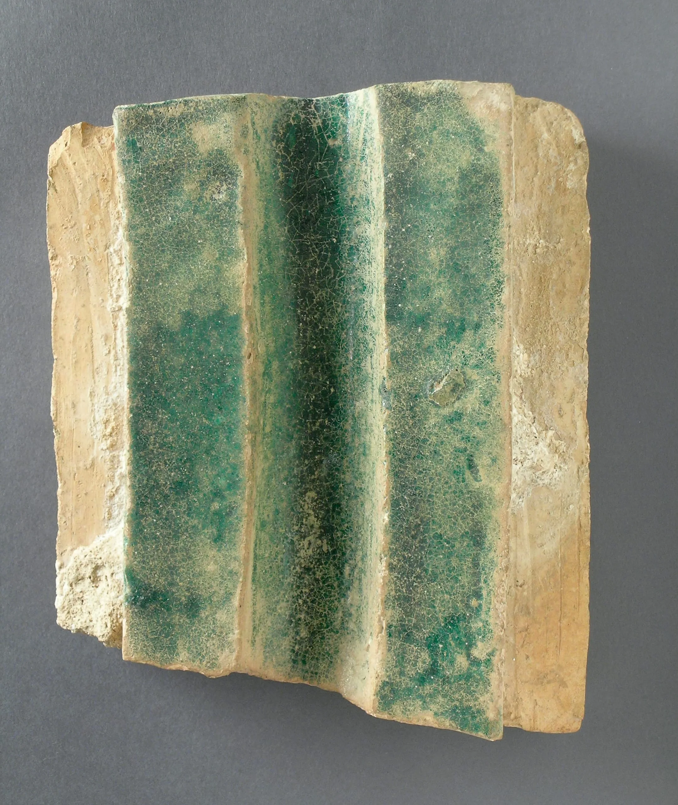 Ceramic architectural fragment with three vertical ribs covered in a crackled turquoise and teal glaze, broken edges exposing sandy buff clay body