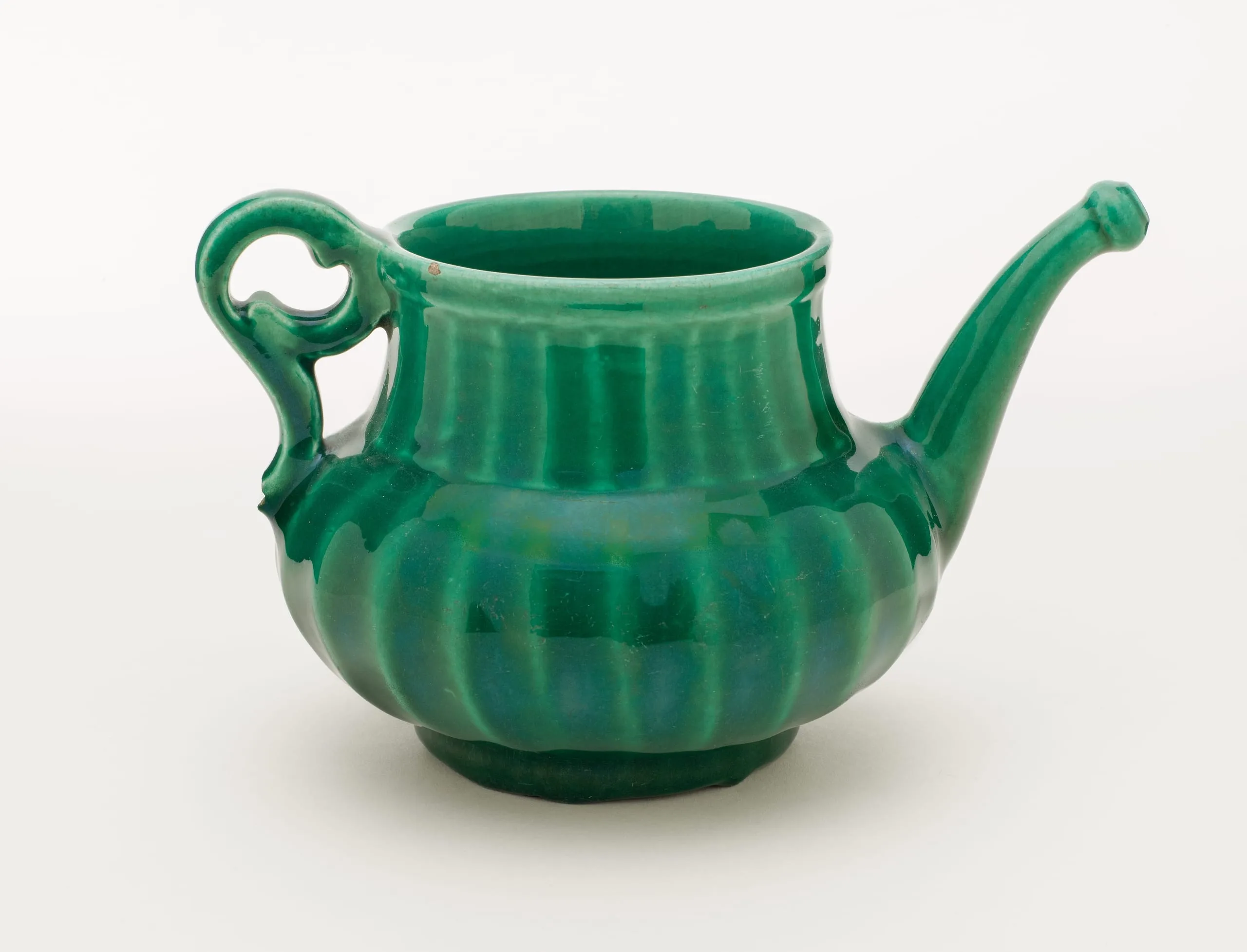 Both practical and pleasing to the senses, this spouted ewer exemplifies the transformation of utilitarian implements into objects of beauty, which typifies Islamic art. Its elegant form and striking green glaze appeal to the eye, while the ribbing at the sides provides an agreeable tactile quality. The gurgling sound of the liquid poured from the spout and its taste completed the sensory experience, which we can only imagine today.