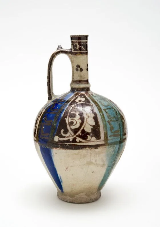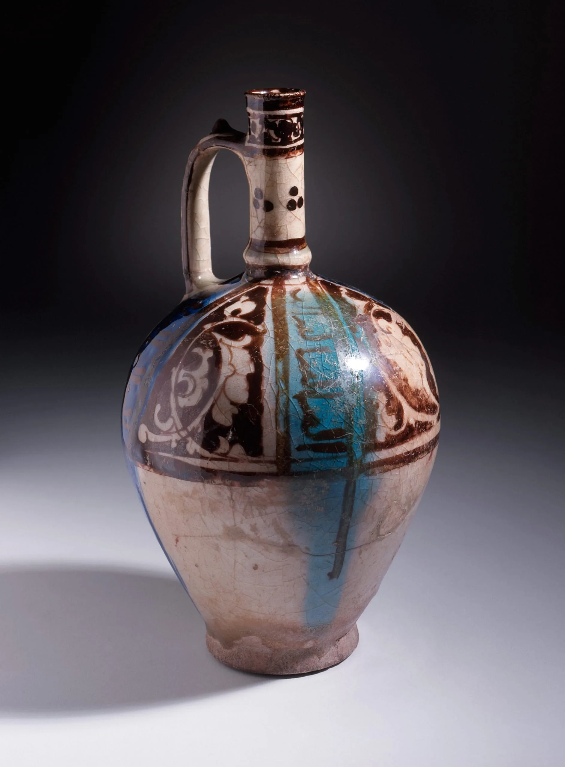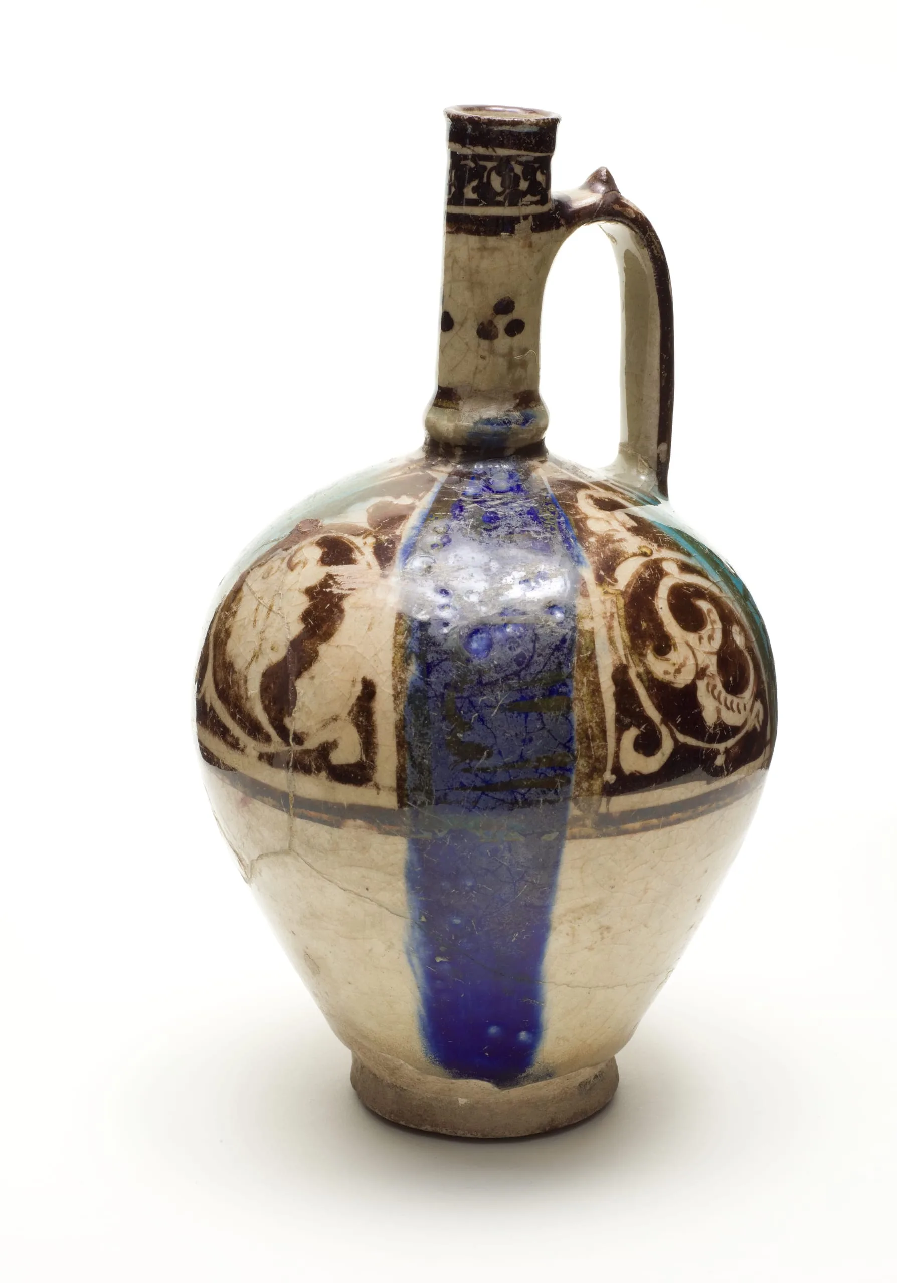 The bright bursts of cobalt blue and turquoise on the body of this jug were initially colorless when they were applied and did not gain their final hue until after firing. Ceramics from the Islamic world, but especially medieval Iran, often feature incongruous splats of blue, turquoise, or green that perhaps were originally accidental but were later adopted as part of a vessel’s decoration. Here the alternating streaks of blue and turquoise are a continuation of the "accidental" drip made intentional.