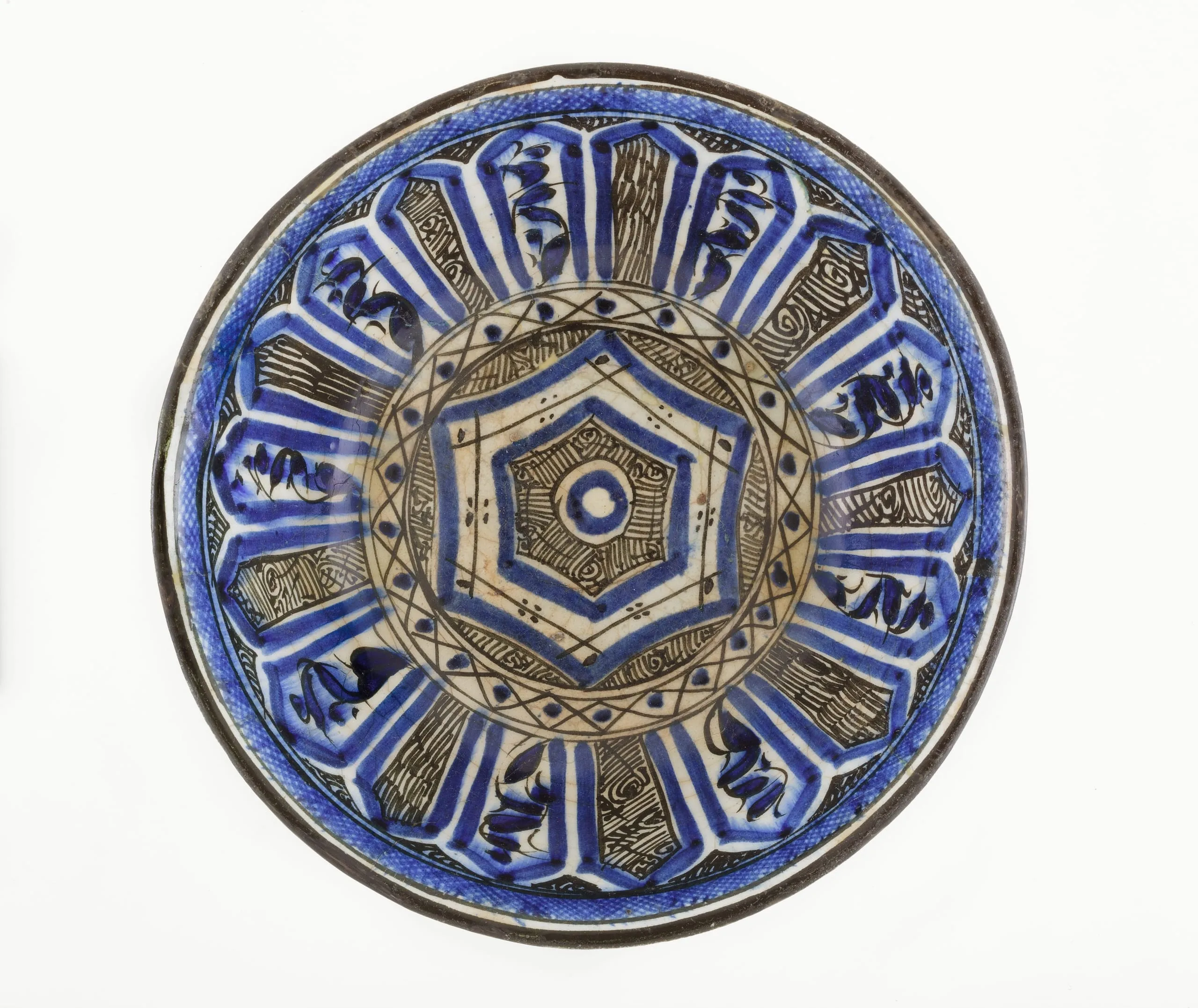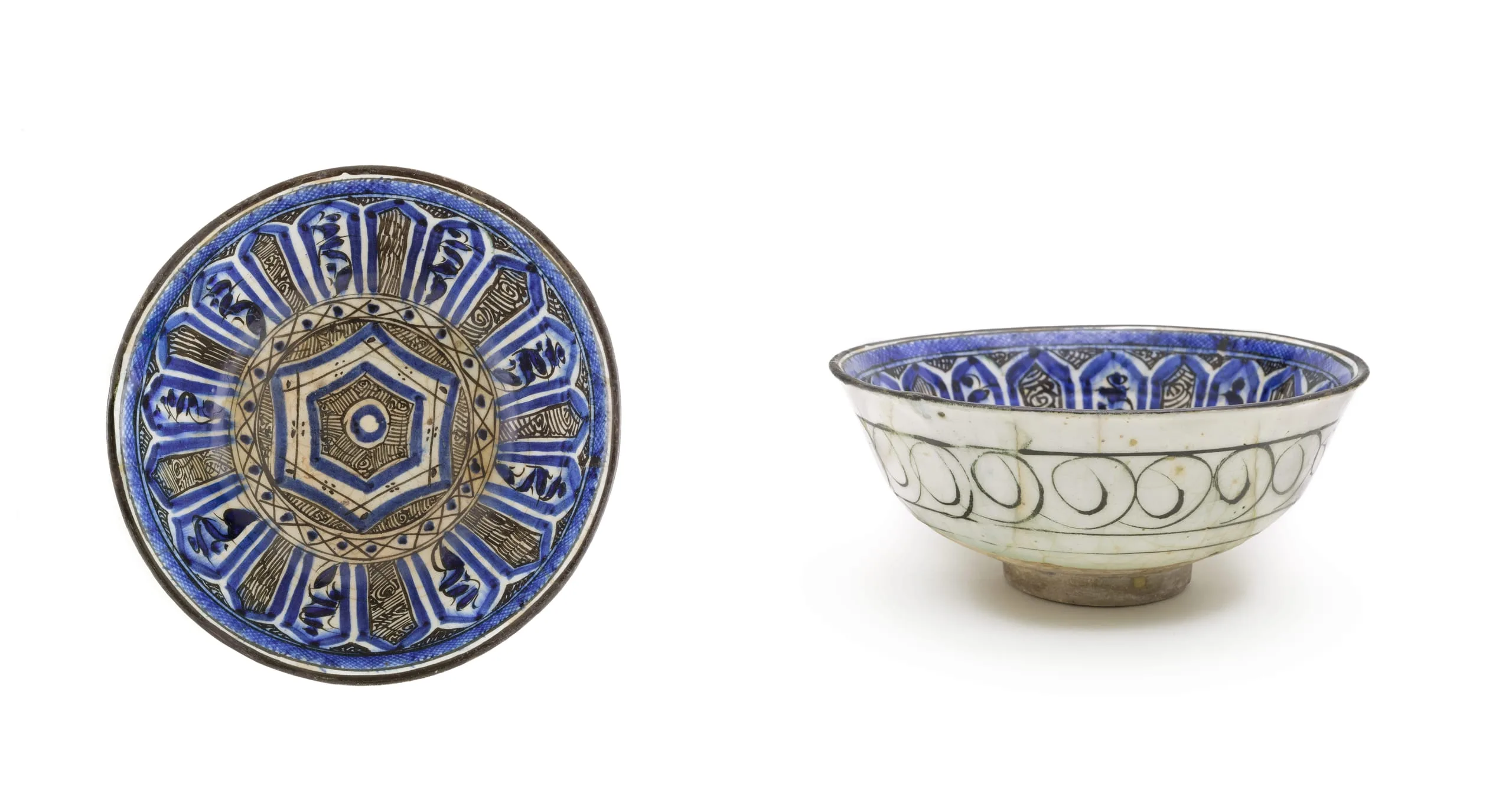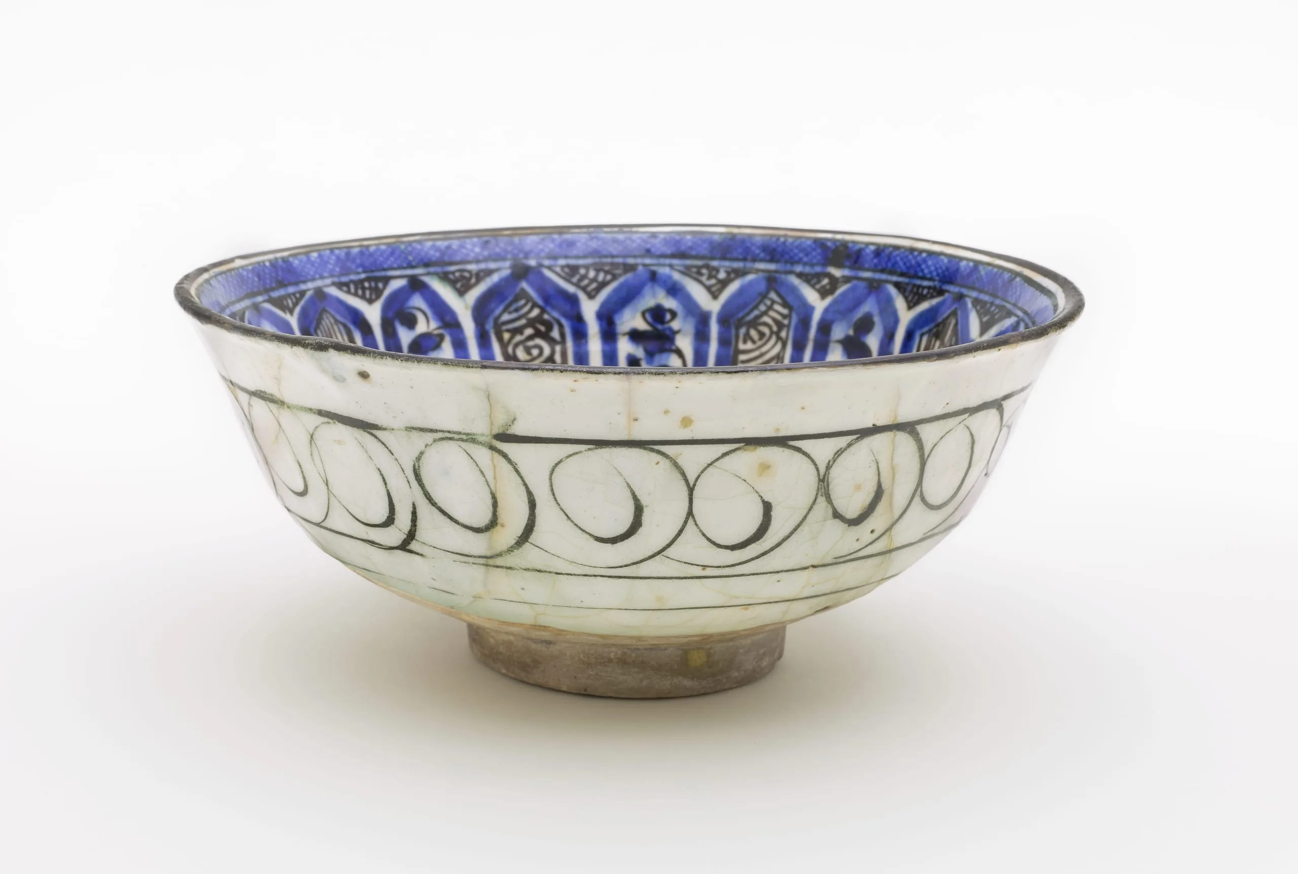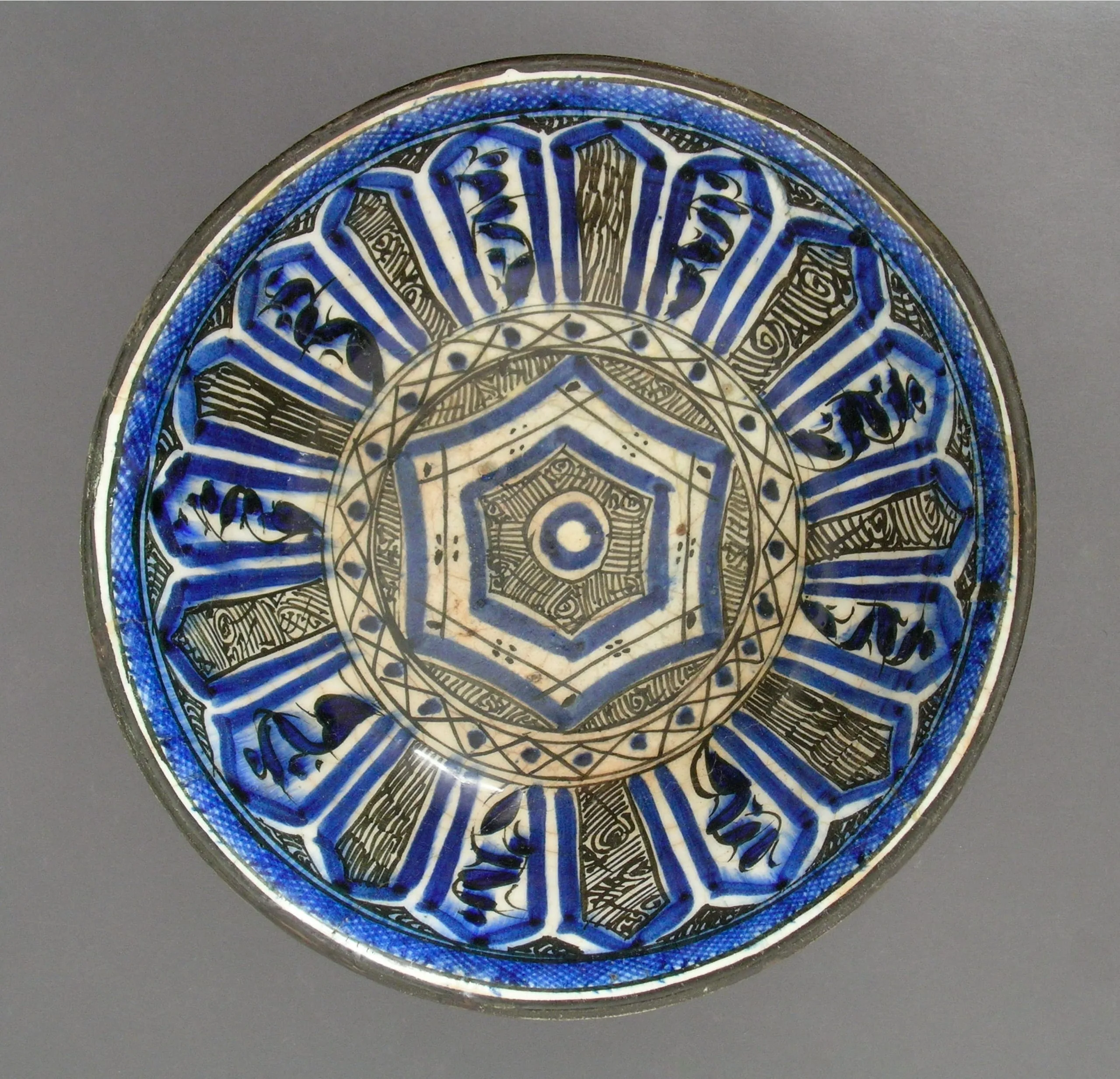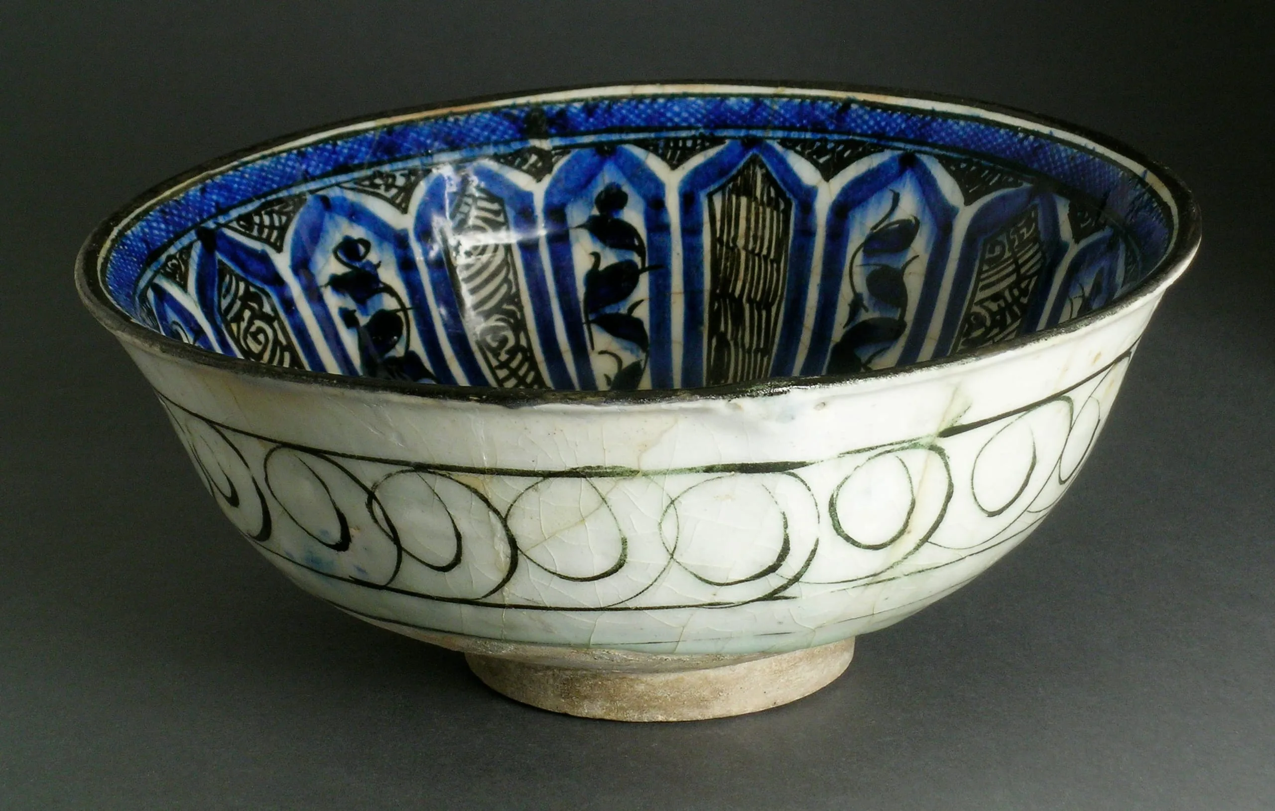 For centuries, Chinese ceramics served as a source of inspiration for Islamic potters, who freely adopted and adapted those attributes that would best appeal to their clientele. Here the blue, white, and black color scheme is derived from Chinese blue and white porcelains, but this Iranian vessel maintains the geometric and floral decorative vocabulary commonly found in Islamic art, representing a fusion between the cultures.