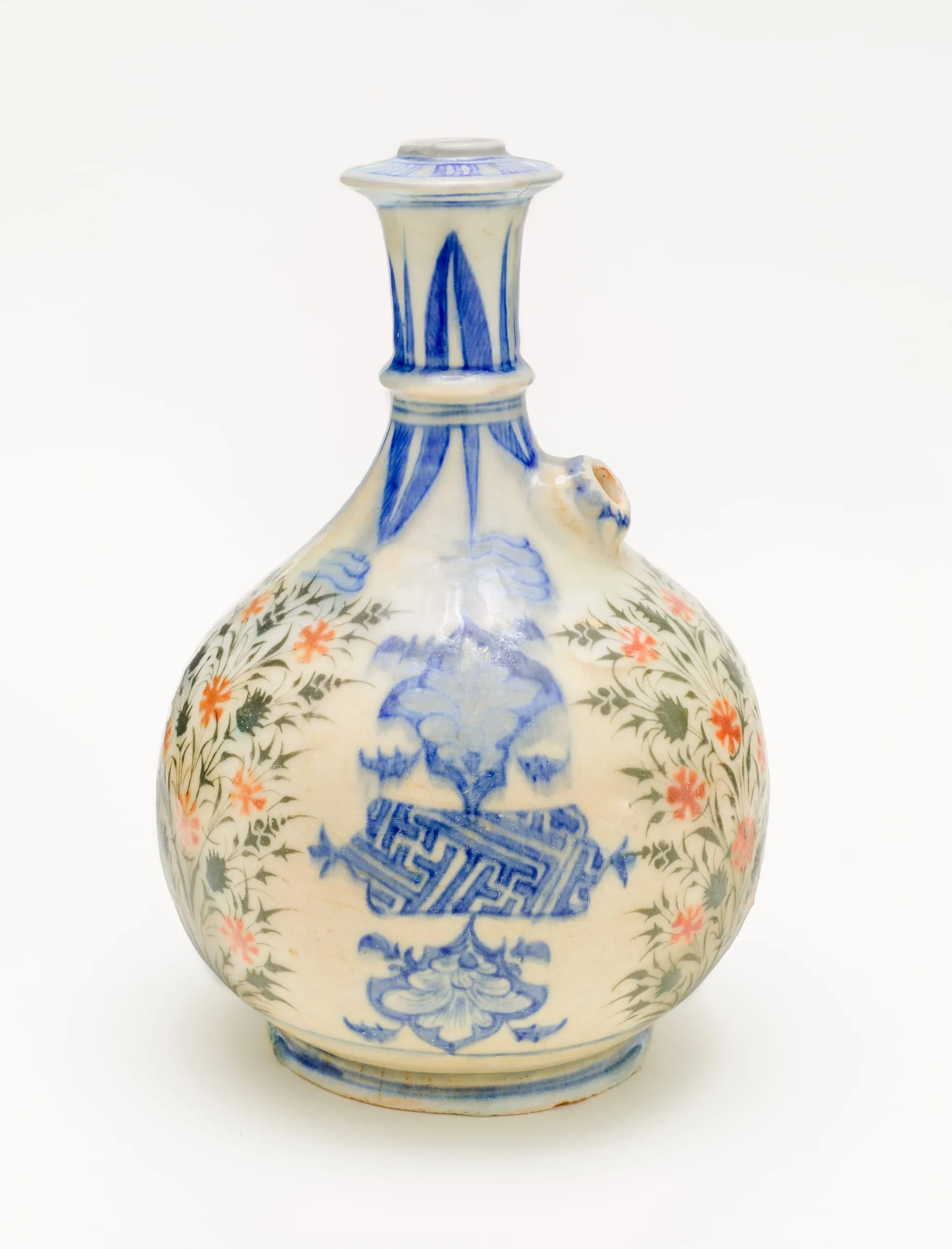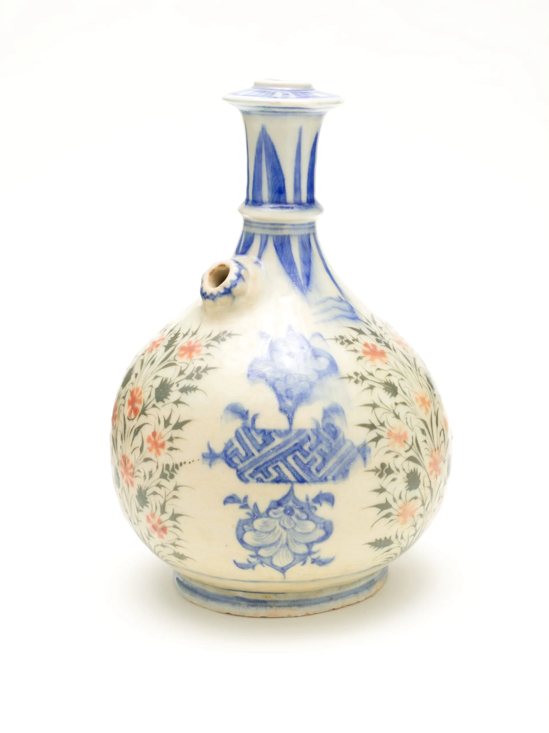 With the introduction of imported tobacco to the Iranian market around 1600 and its widespread domestic cultivation within a few decades, water pipes became a mainstay of daily life. Such implements were smoked at home for leisure by both men and women, in coffeehouses to stimulate discussion, and even in schools to help focus the mind of both teacher and pupil. They were produced in a variety of materials to satisfy consumers across the socioeconomic spectrum, from humble versions made of coconut shells to more elaborate metalwork and glazed ceramic forms, such as this example.