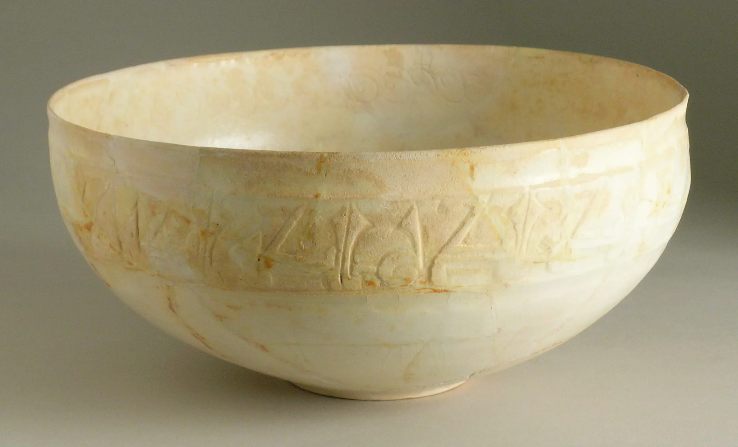 Hemispherical bowl carved from translucent ivory-white alabaster with rust-orange veining, featuring a wide incised band of angular geometric motifs around the exterior