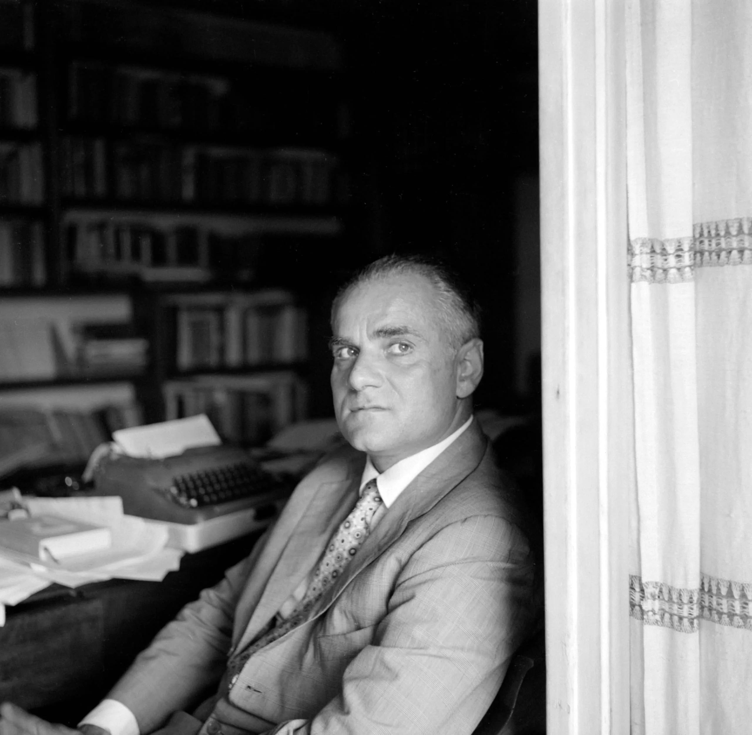 Black and white photograph, white man with gray hair in a suit and patterned tie, arms crossed, seated before a cluttered desk and bookshelves