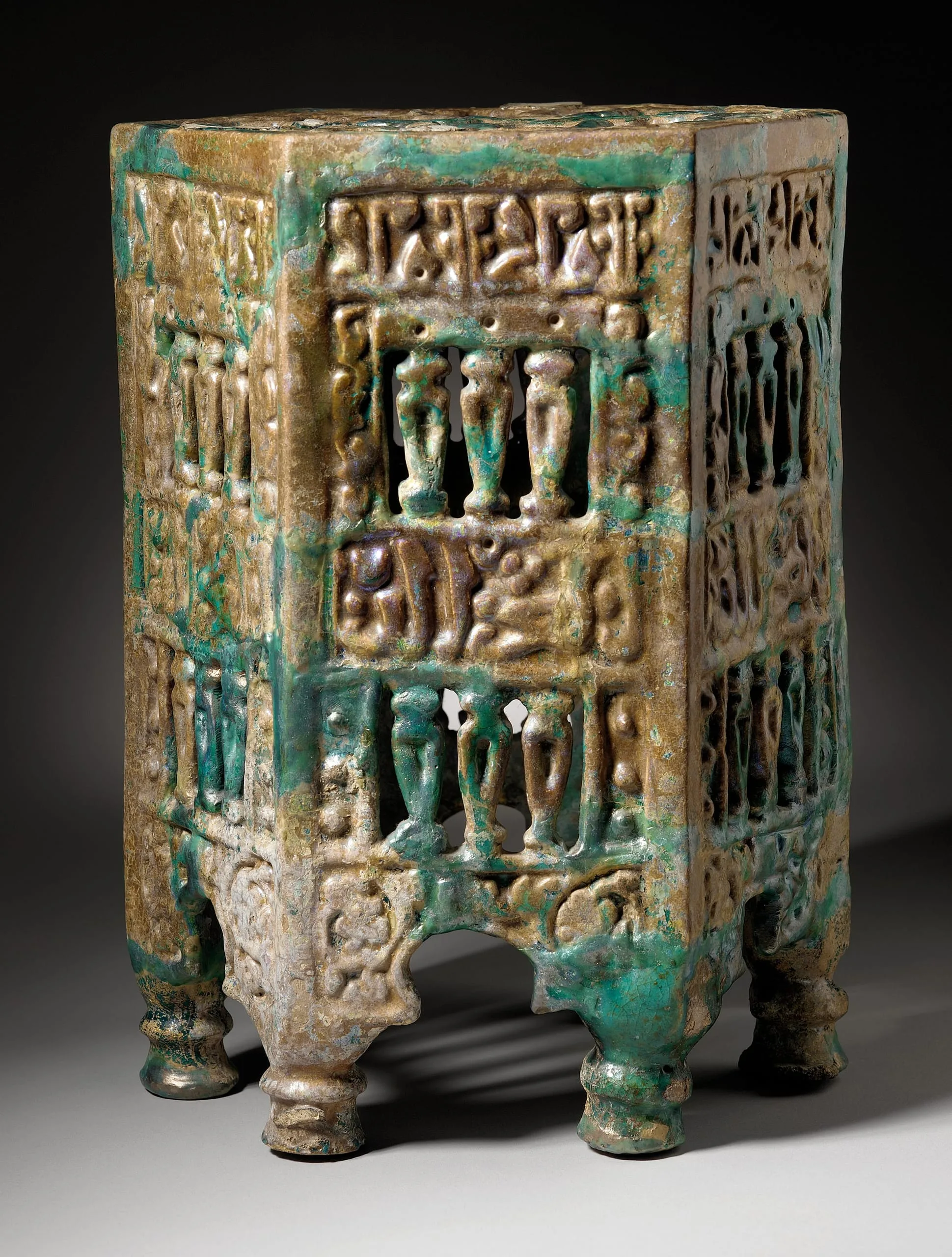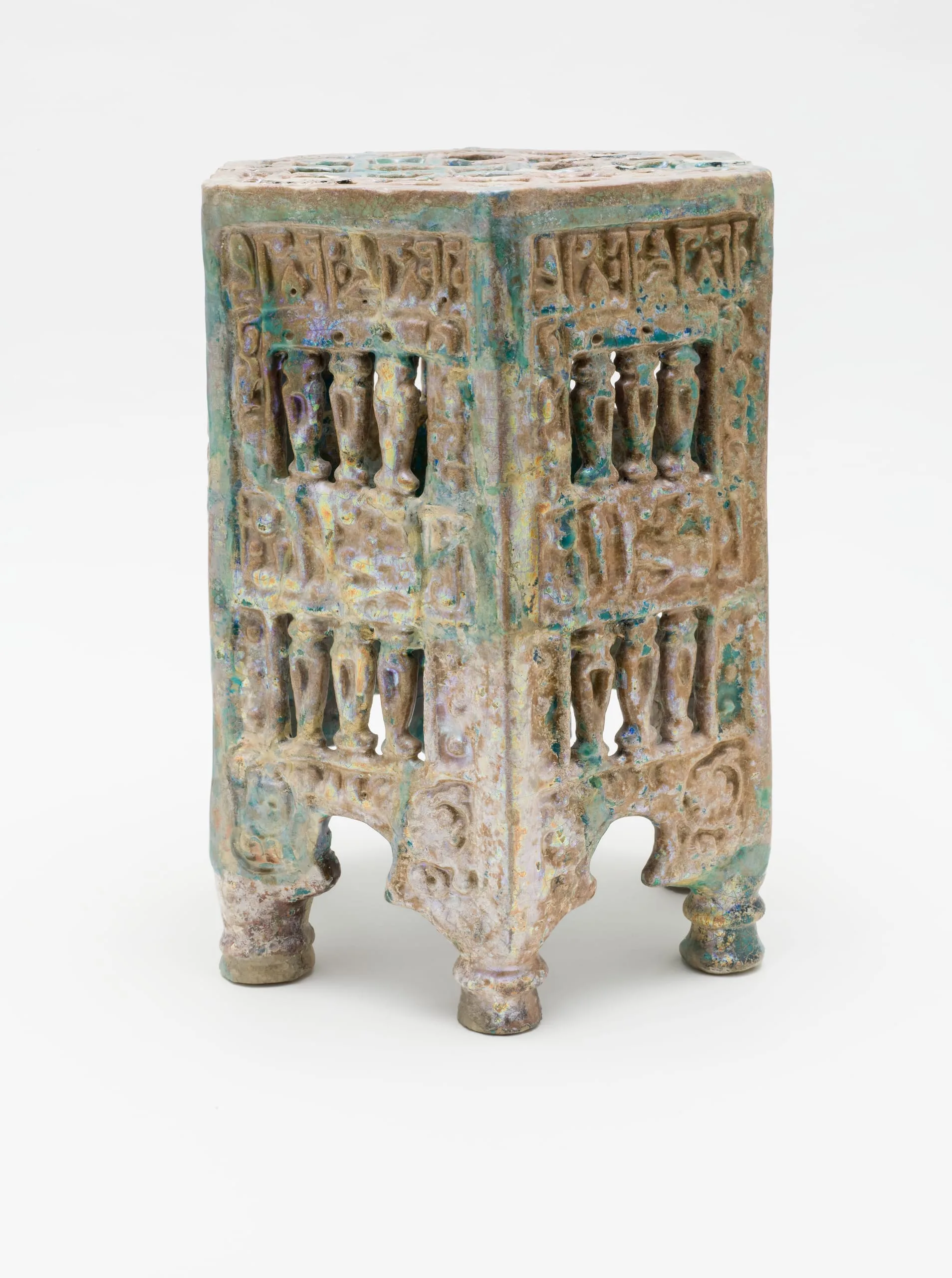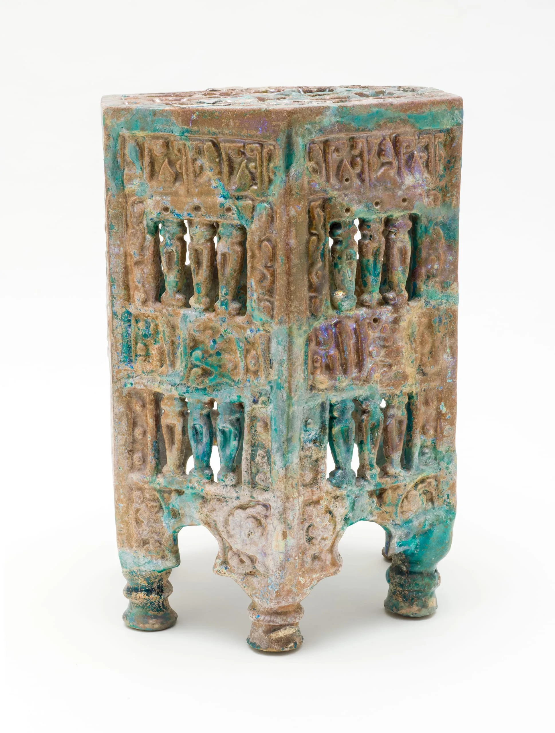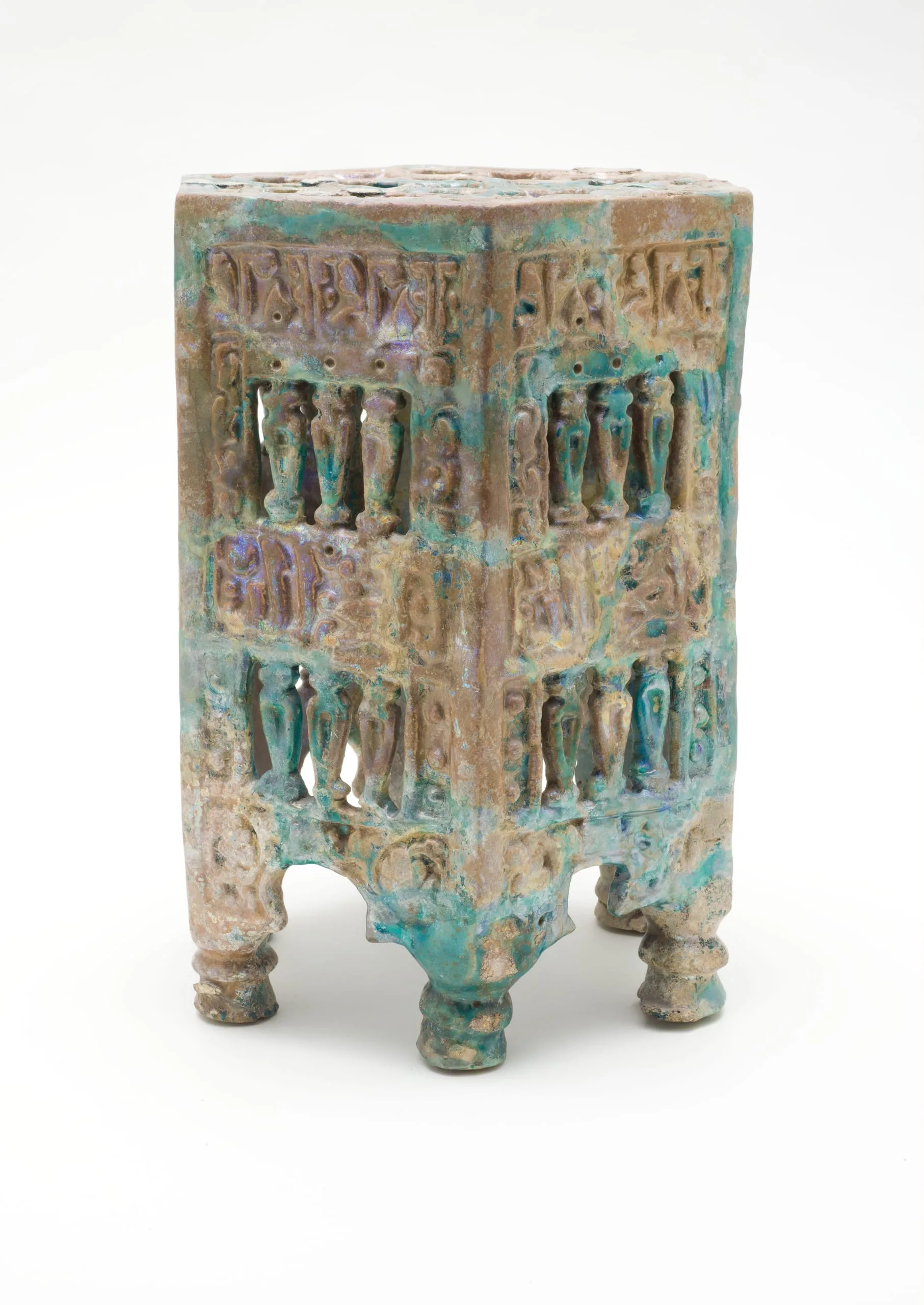 With the introduction of fritware, which is more cohesive than earthenware in its working state, twelfth-century Syrian potters branched out into producing ceramic furniture, such as this turquoise-glazed table. Six-sided tables of this type are believed to be based on wooden versions that have not survived. Perhaps in reference to the spaces in which they were used, the tables feature architectural motifs, such as the miniature pillars (balusters) on the sides and the pierced tabletop that resembles a mashrabiya, a type of window screen with openwork geometric design.