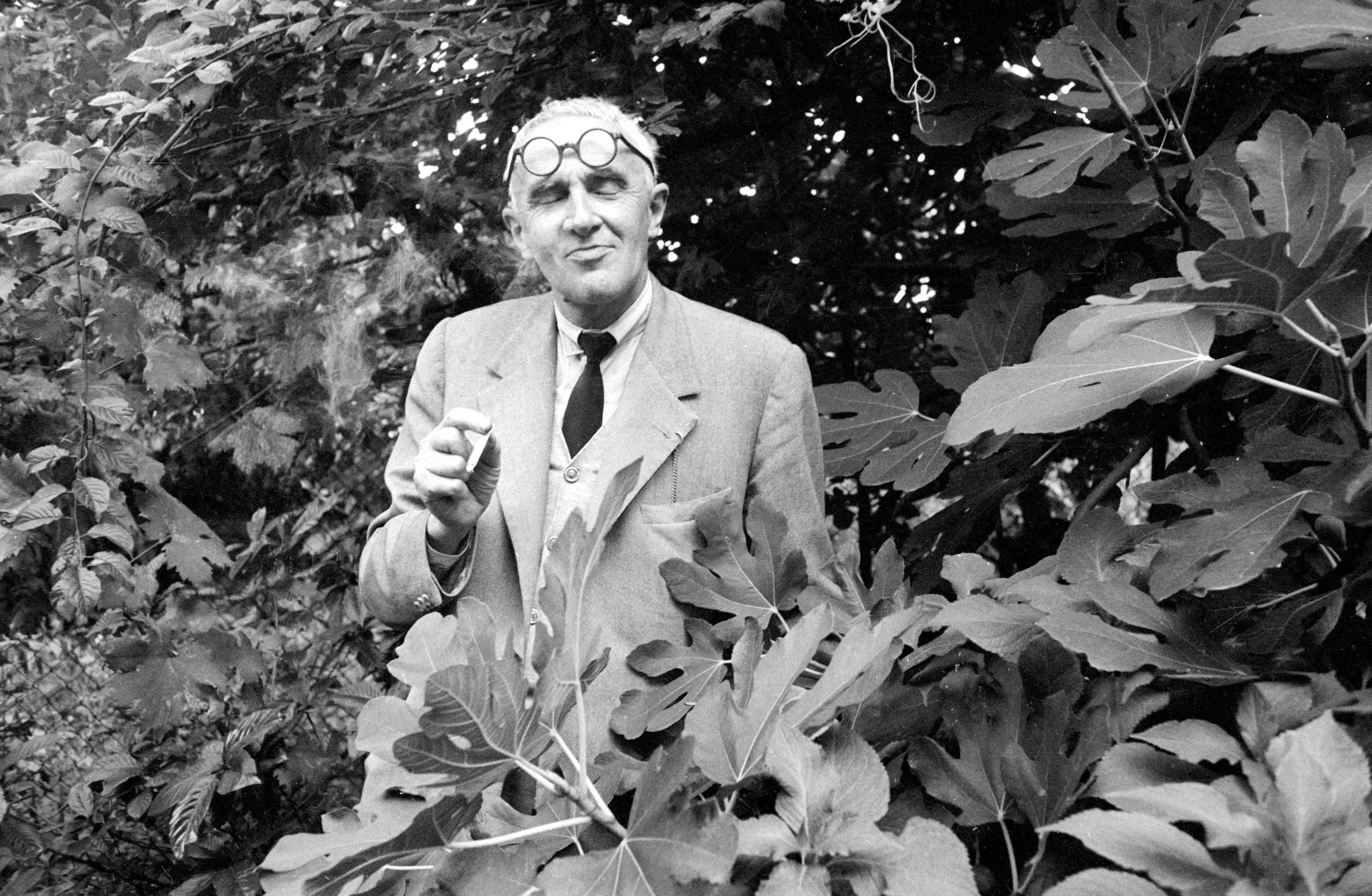 Black and white photograph of a man in a suit with round glasses pushed up on his forehead, standing among large fig tree leaves outdoors