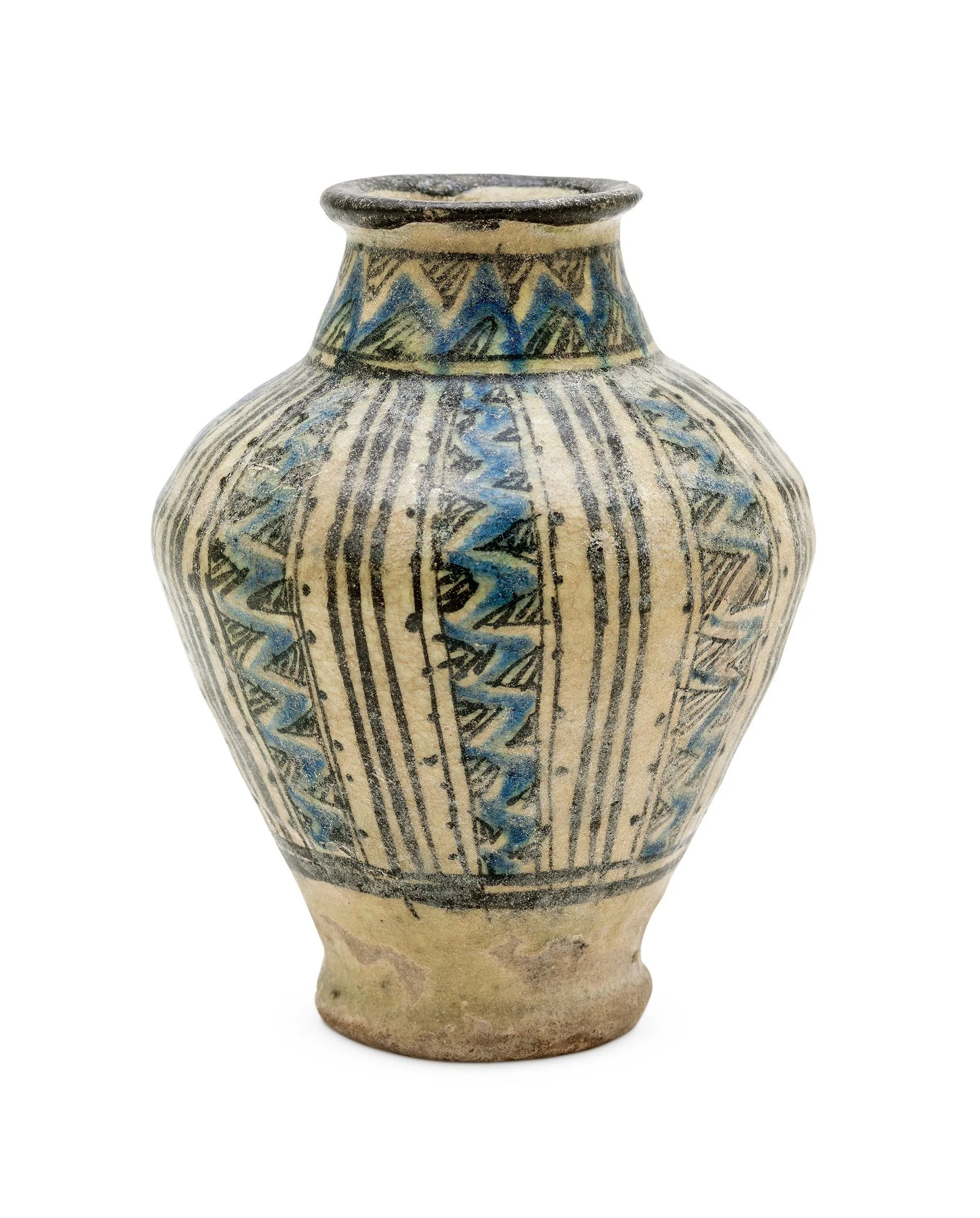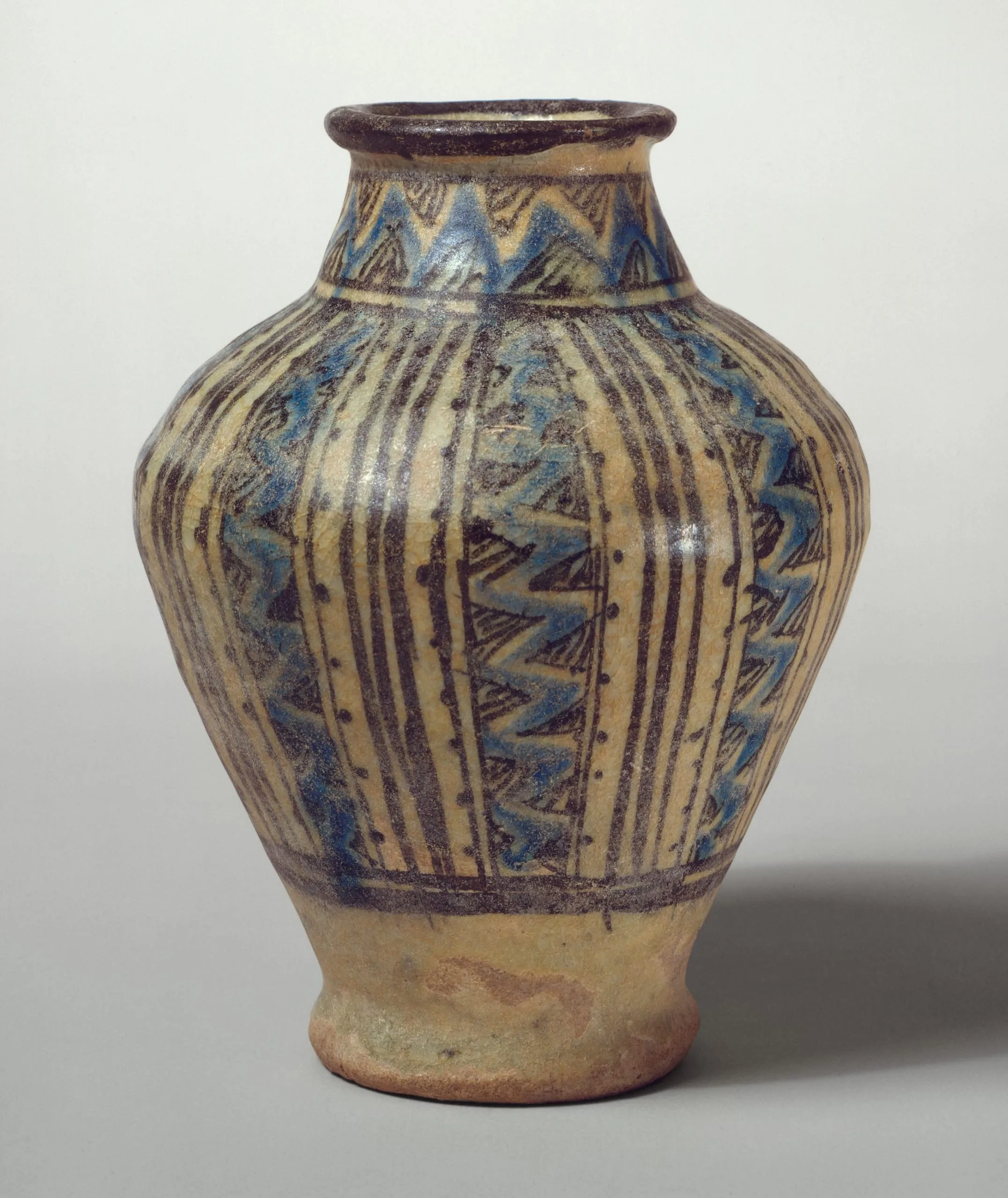 Trade encouraged the diffusion of artistic styles and techniques throughout the Islamic empire in the late medieval period. One example is the spread of "Sultanabad-style" ceramics, named for a region of Iran where they were found, from Iran to Syria and Egypt in the fourteenth and fifteenth centuries. This jar is decorated in a particular and oft-repeated manner in which the surface is divided into alternating panels filled with patterns such as lines, flowers, and scrolls (see the related bowl, M.2002.1.66).