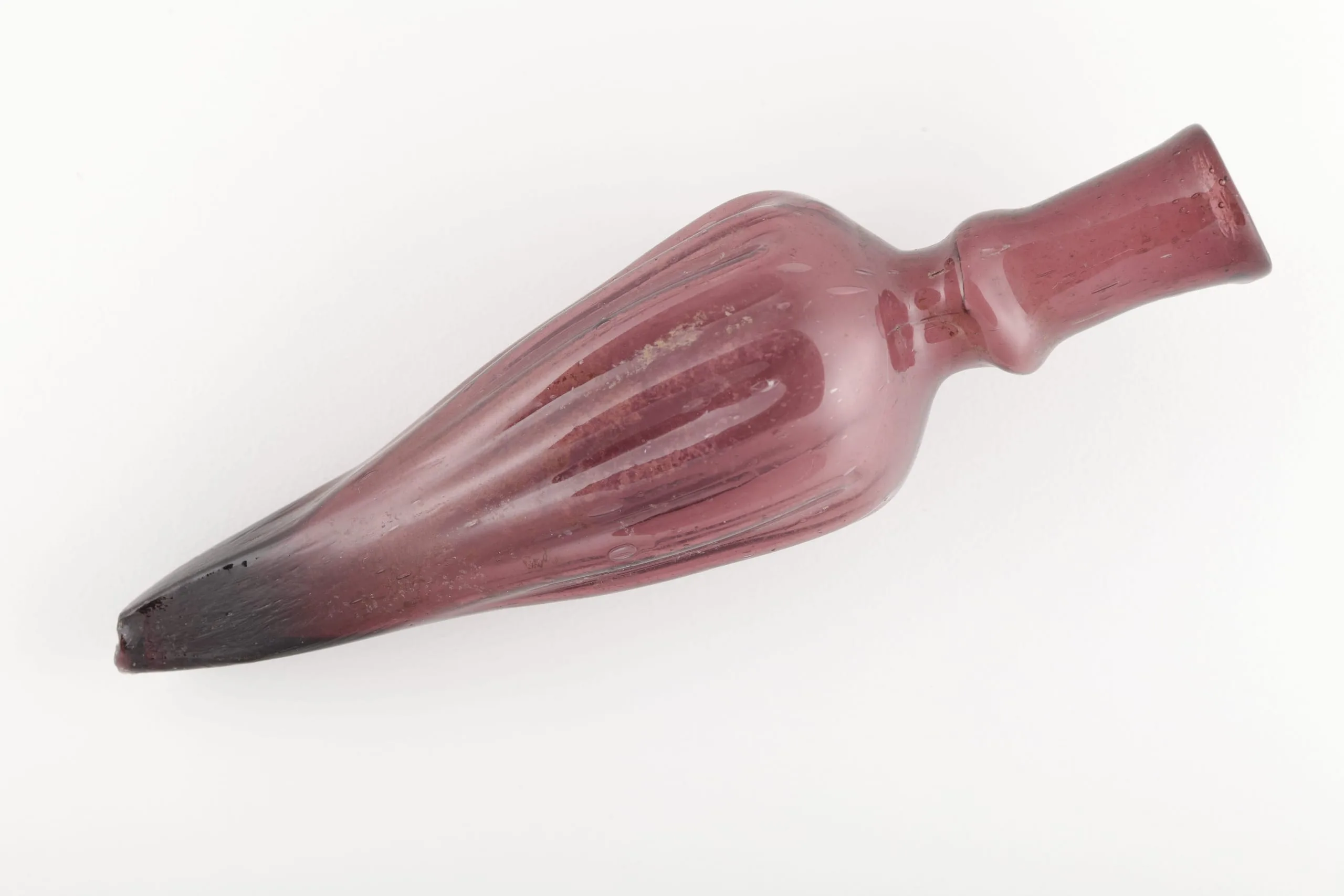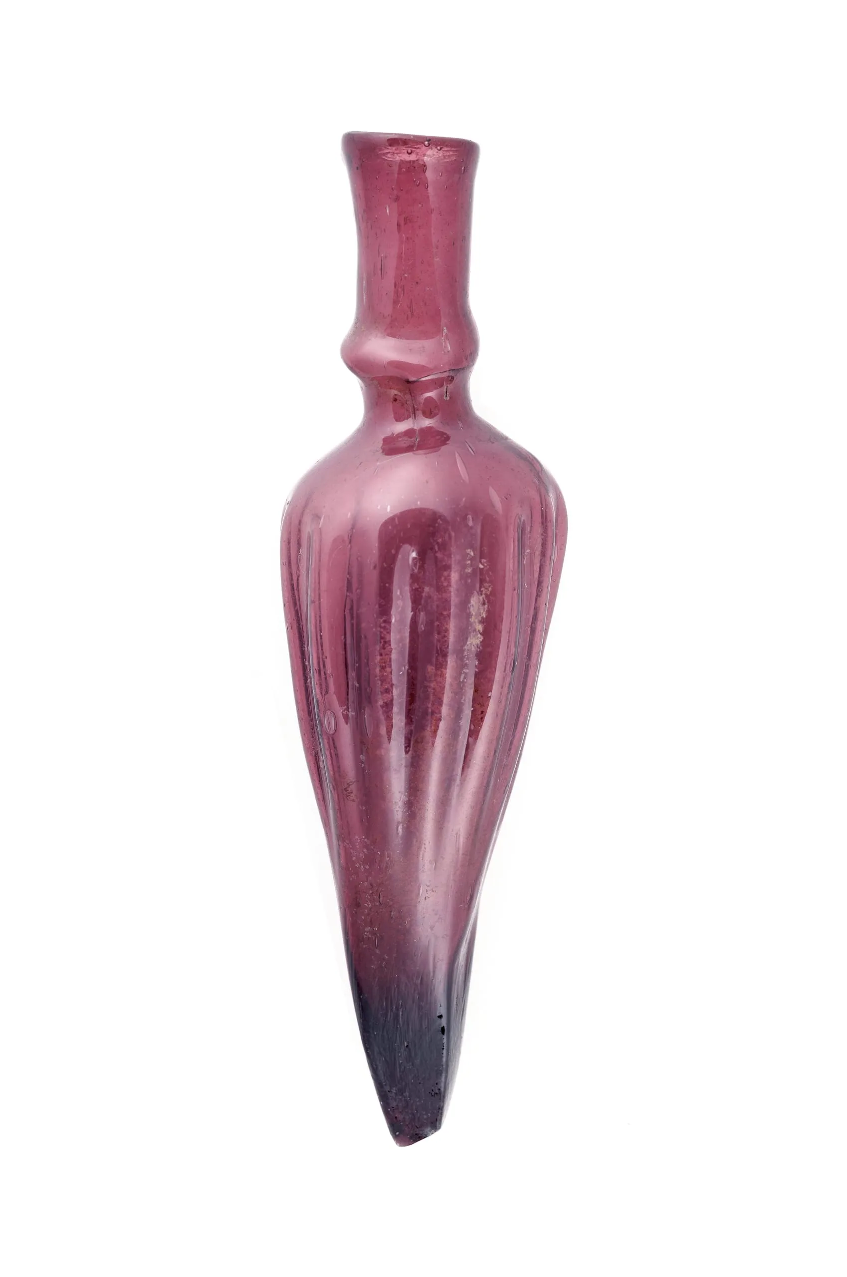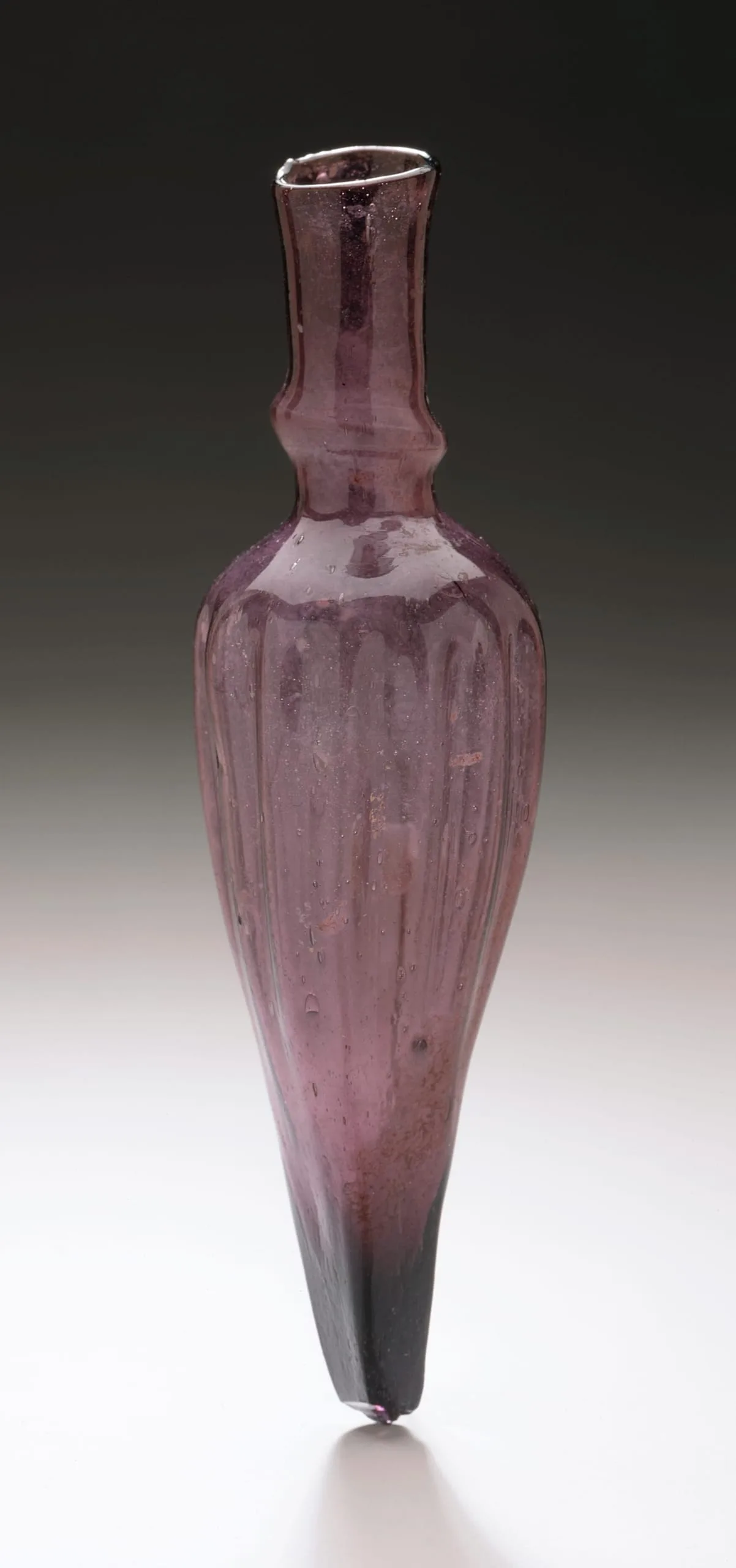 This bottle features fluted decoration along its body produced by blowing molten glass into a ribbed mold. Its tapering form represents a type that was designed to hold nonliquid cosmetics like kohl, a mixture of lead or charcoal combined with oils and used since ancient times as eyeliner.