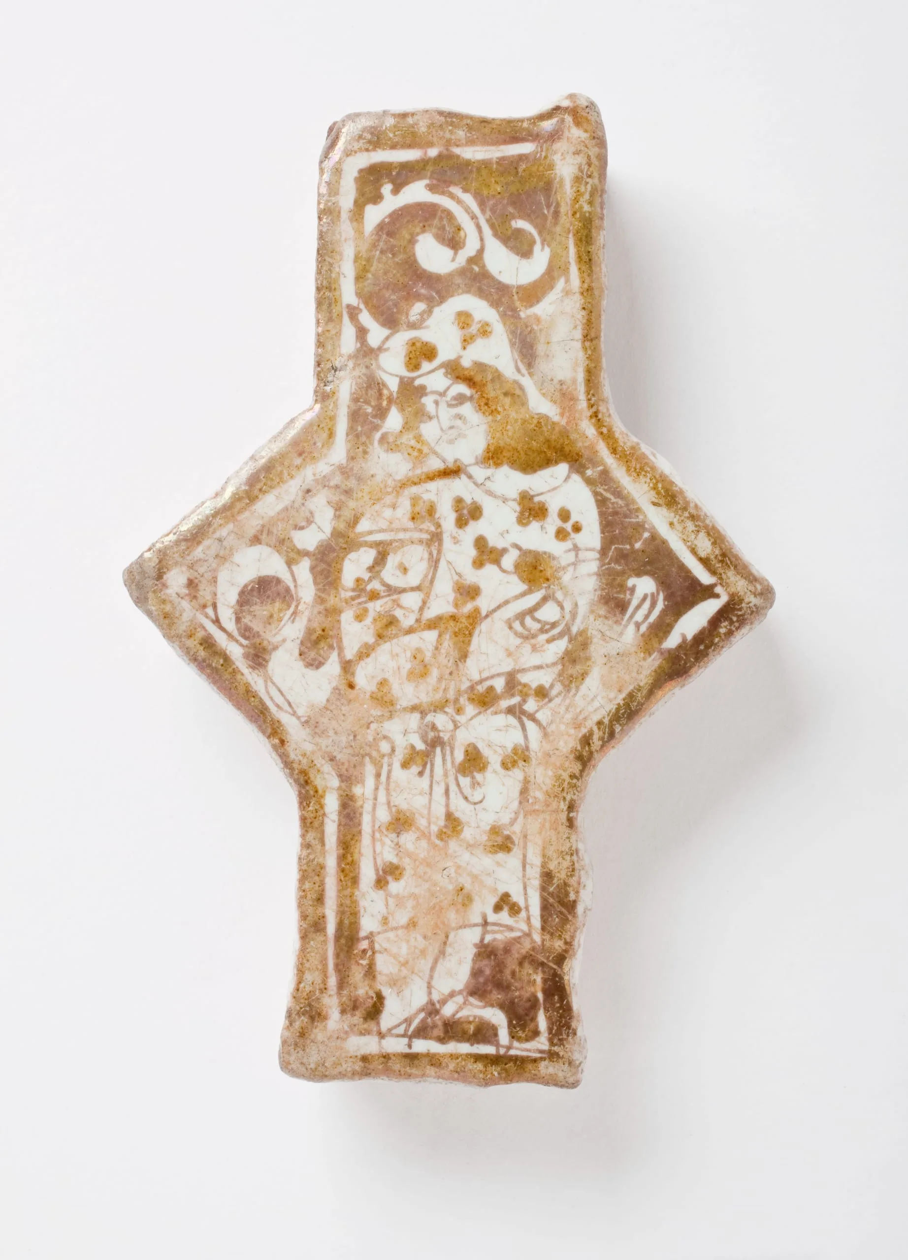 Cross-shaped ceramic tile with cream slip glaze and amber-brown painted decoration depicting a standing robed figure with raised hands, surrounded by scrolling vine motifs