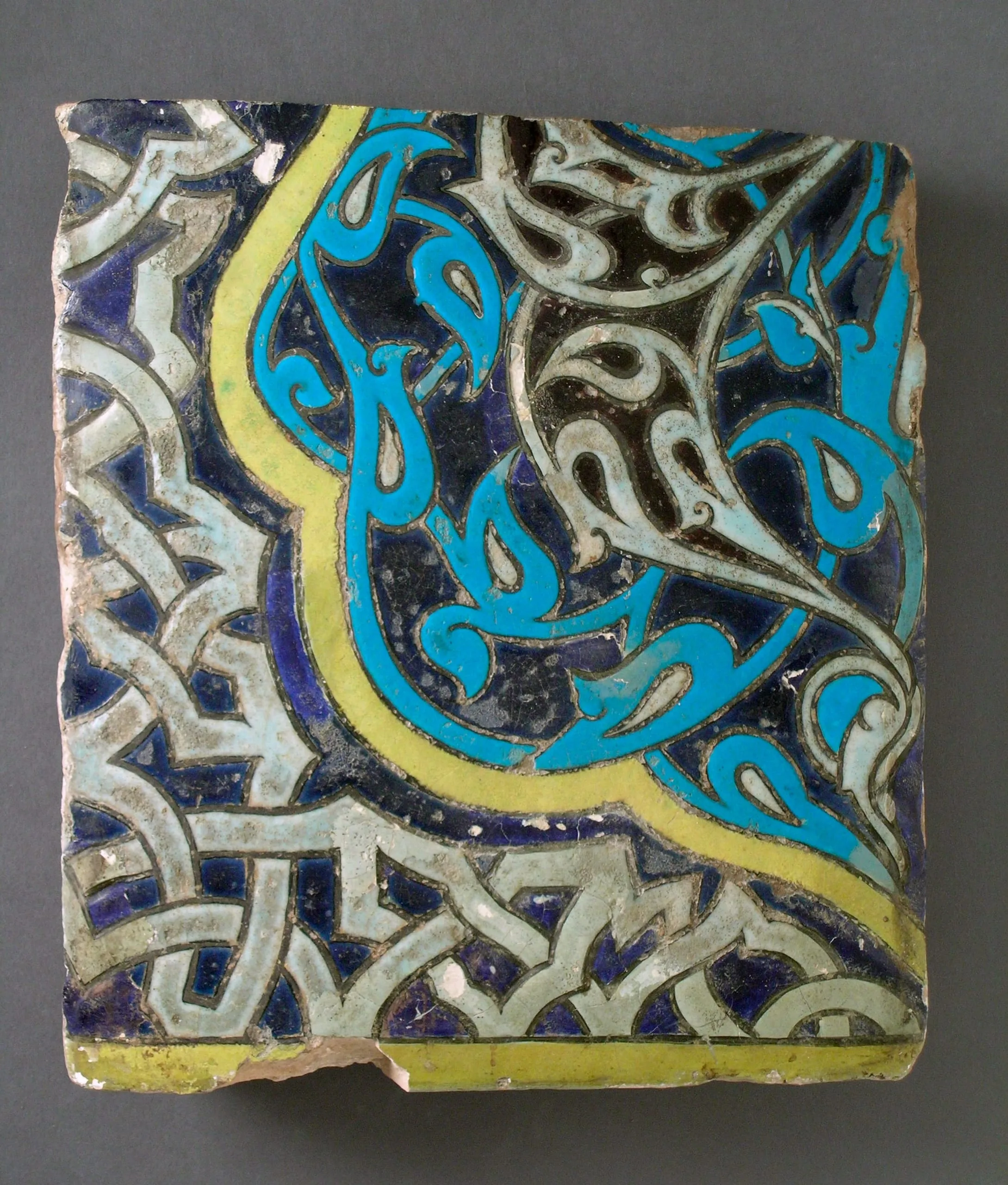 Ceramic tile fragment with cobalt blue interlaced knotwork, vivid turquoise Arabic calligraphy, and a chartreuse yellow dividing band against a dark ground