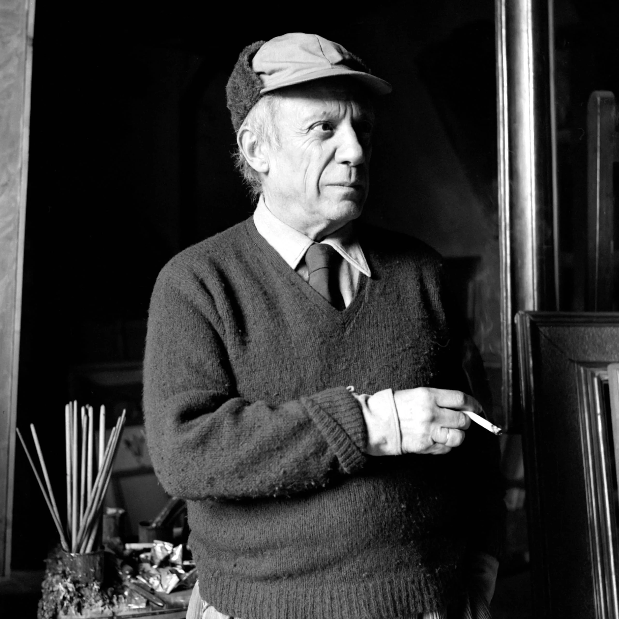 Black and white portrait photograph, older man from the hips up, wearing a flat cap and chunky V-neck sweater, arms crossed, holding a cigarette, in what appears to be an artist's studio