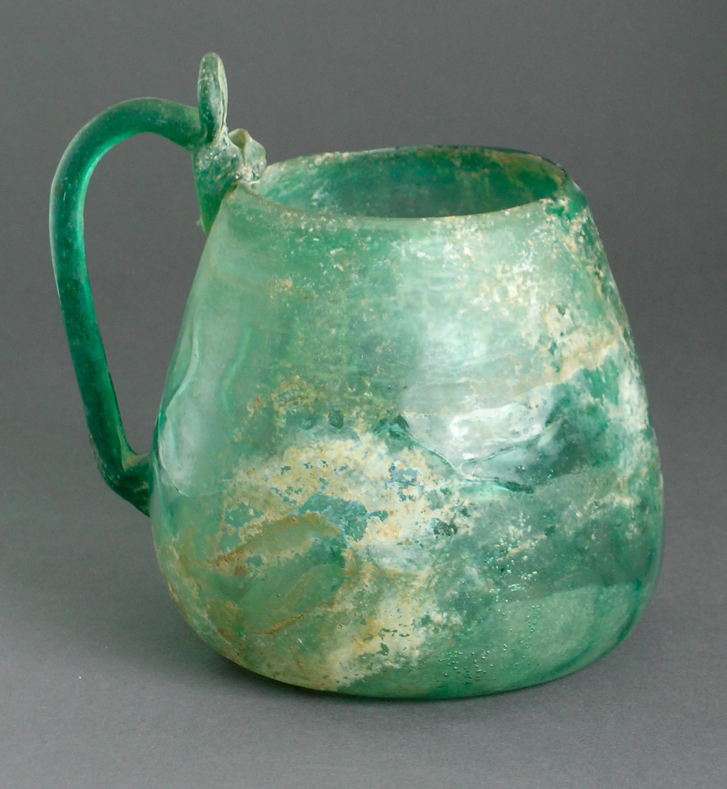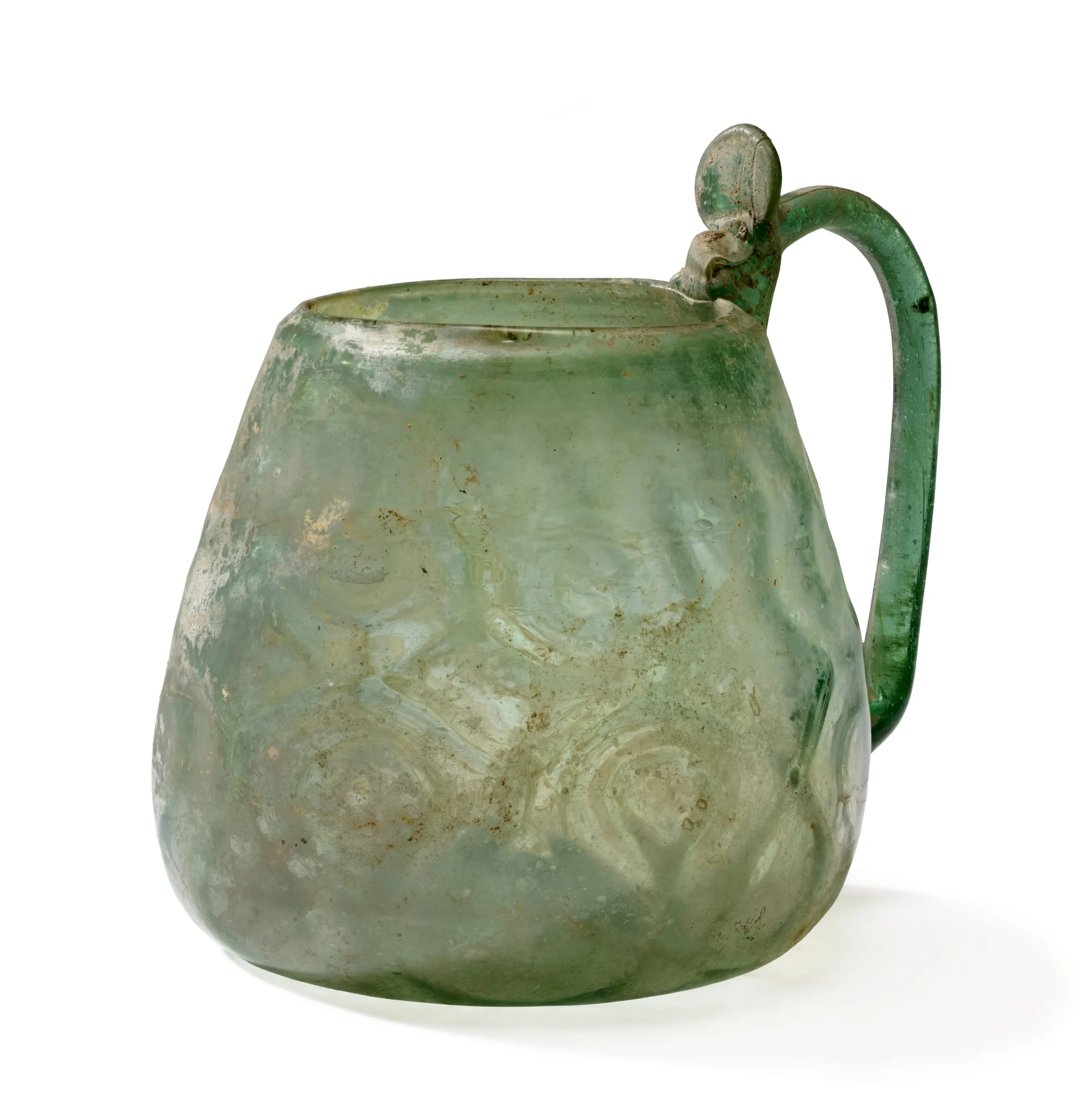 - Glass, mold-blown and tooled with applied handle, pontil on base