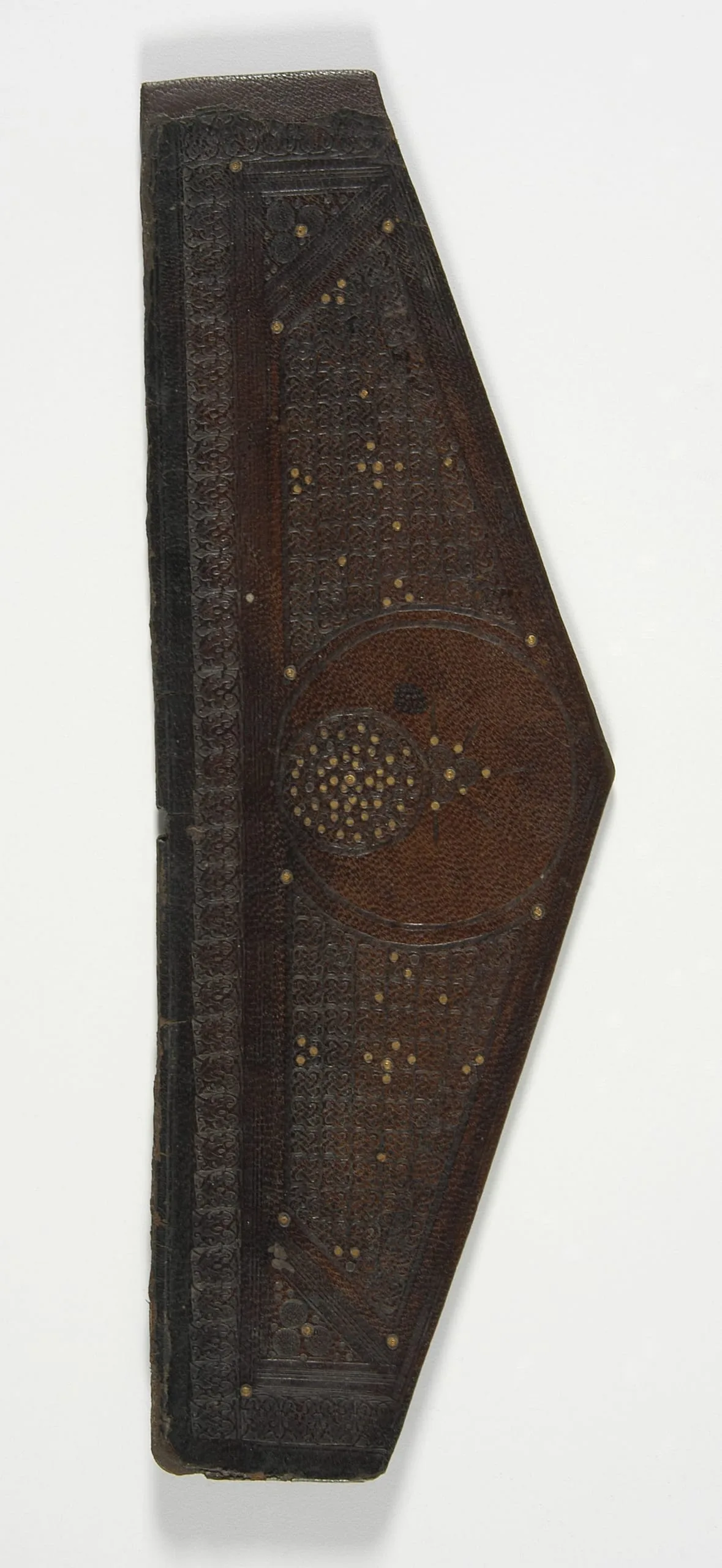 - Leather over paper pasteboards, blind and gold tooled, doublure block-pressed