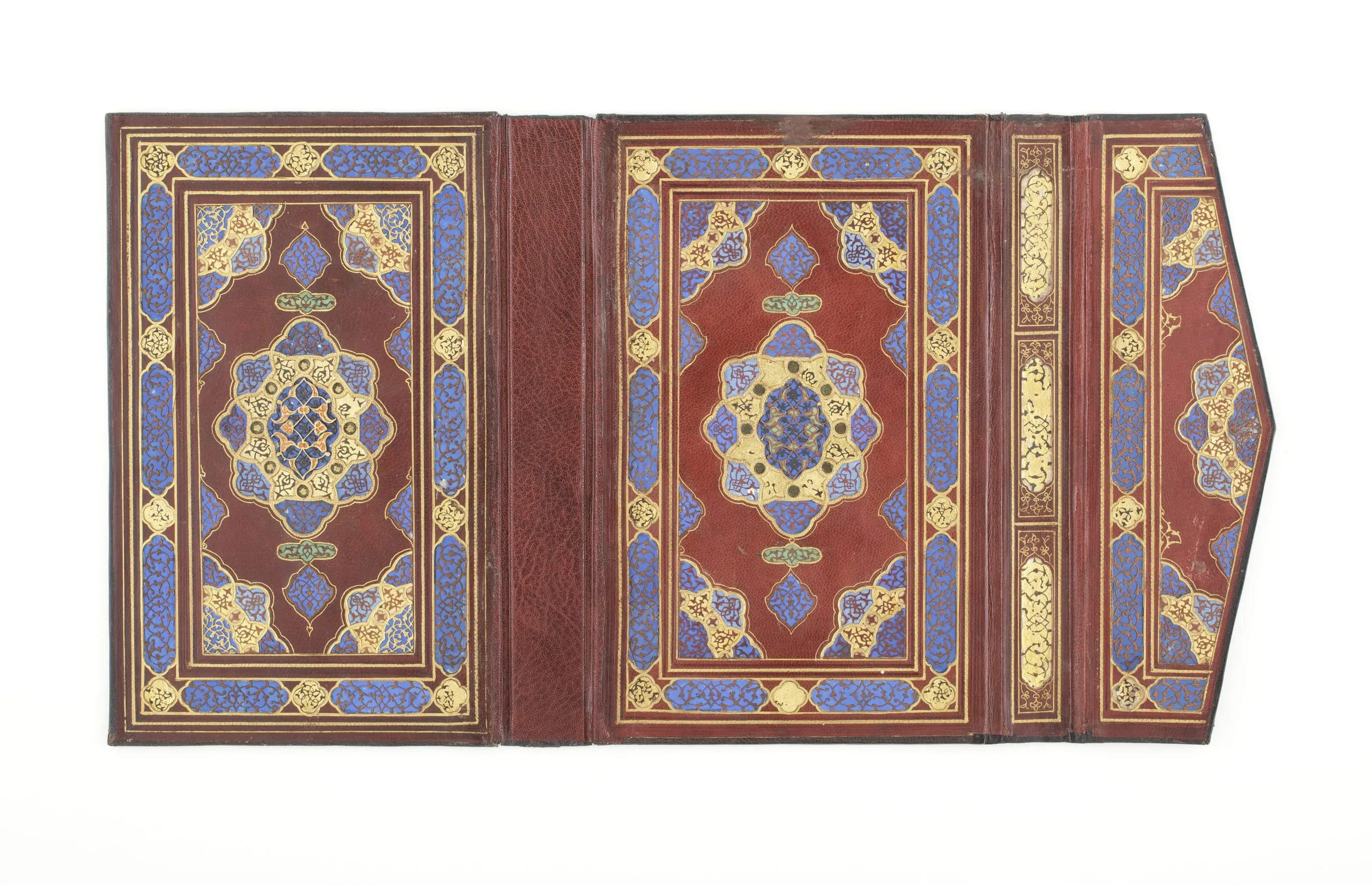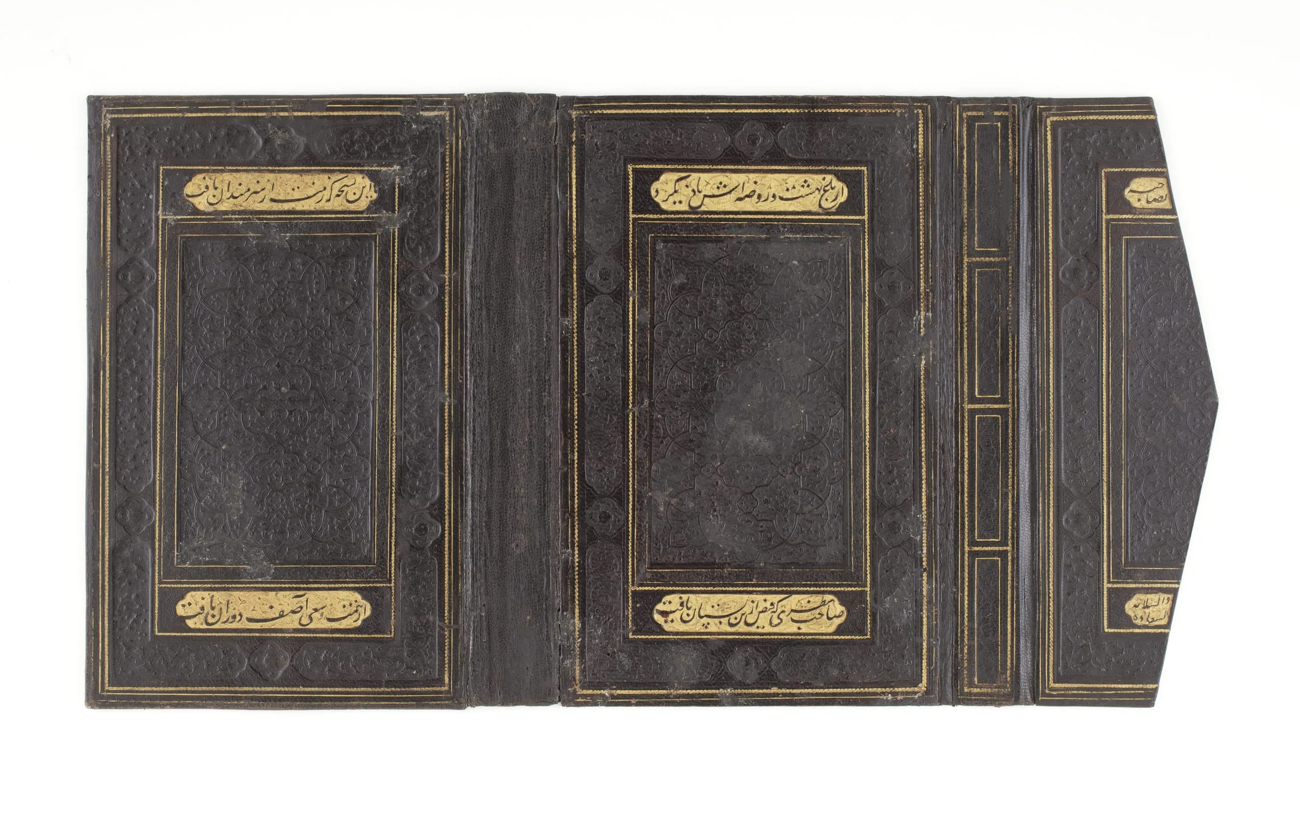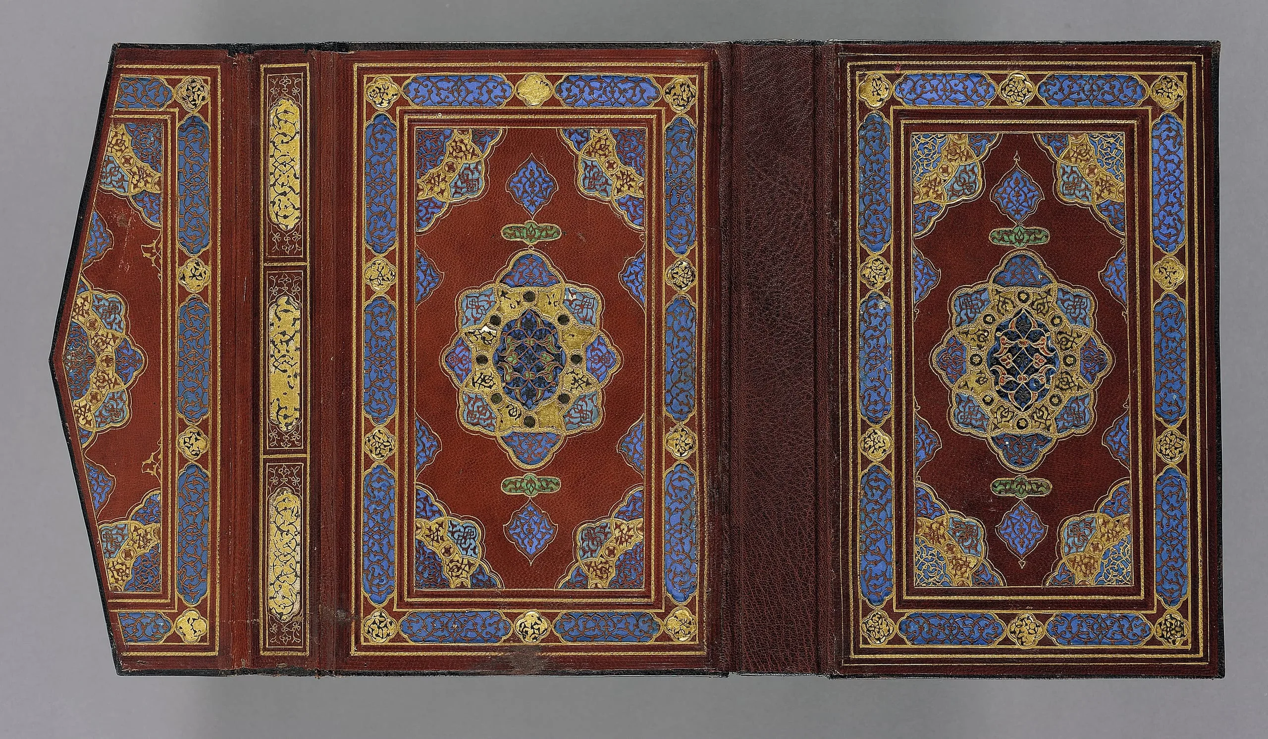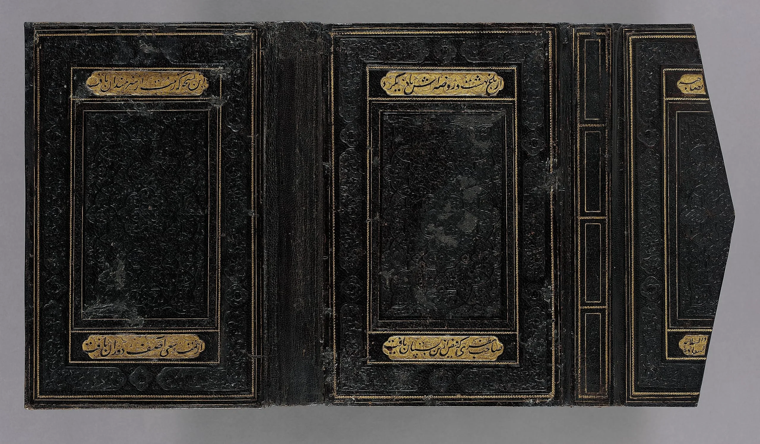 The Persian arts of the book reached spectacular heights in the fifteenth century. Libraries sponsored by princely and elite bibliophiles of the period served not only as repositories of fine books but also as studios where every aspect of manuscript production took place, including the manufacture of bindings. A paragon of the bookbinder’s art, this example (now detached from its manuscript) features painstakingly crafted, brightly colored interior designs made from cut bits of painted leather and tinted paper. The inscription on the exterior of the binding reads: "There would be a reminiscence of Paradise/ For the insightful man, who enjoyed this delightful garden [the book]/ This replica [book] which has gotten its magnificent elaboration from the efforts of the artists/ Was attainable by the effort of the time’s Asif/ May health and prosperity be granted to its possessor."