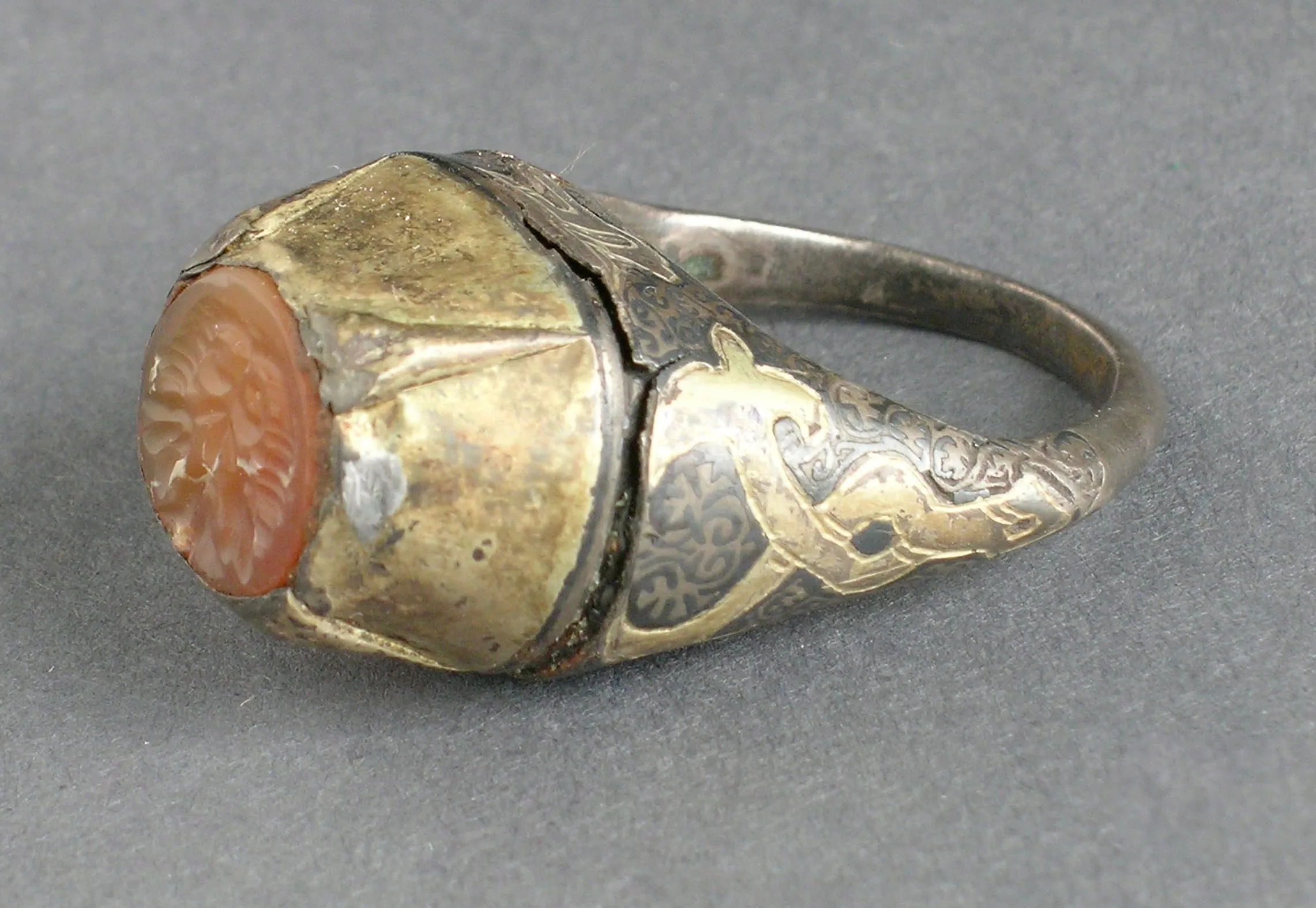 Metal finger ring with faceted brass bezel set with a carved oval carnelian stone, silver band with engraved animal and arabesque decoration on the shoulders, showing age-related patina and wear