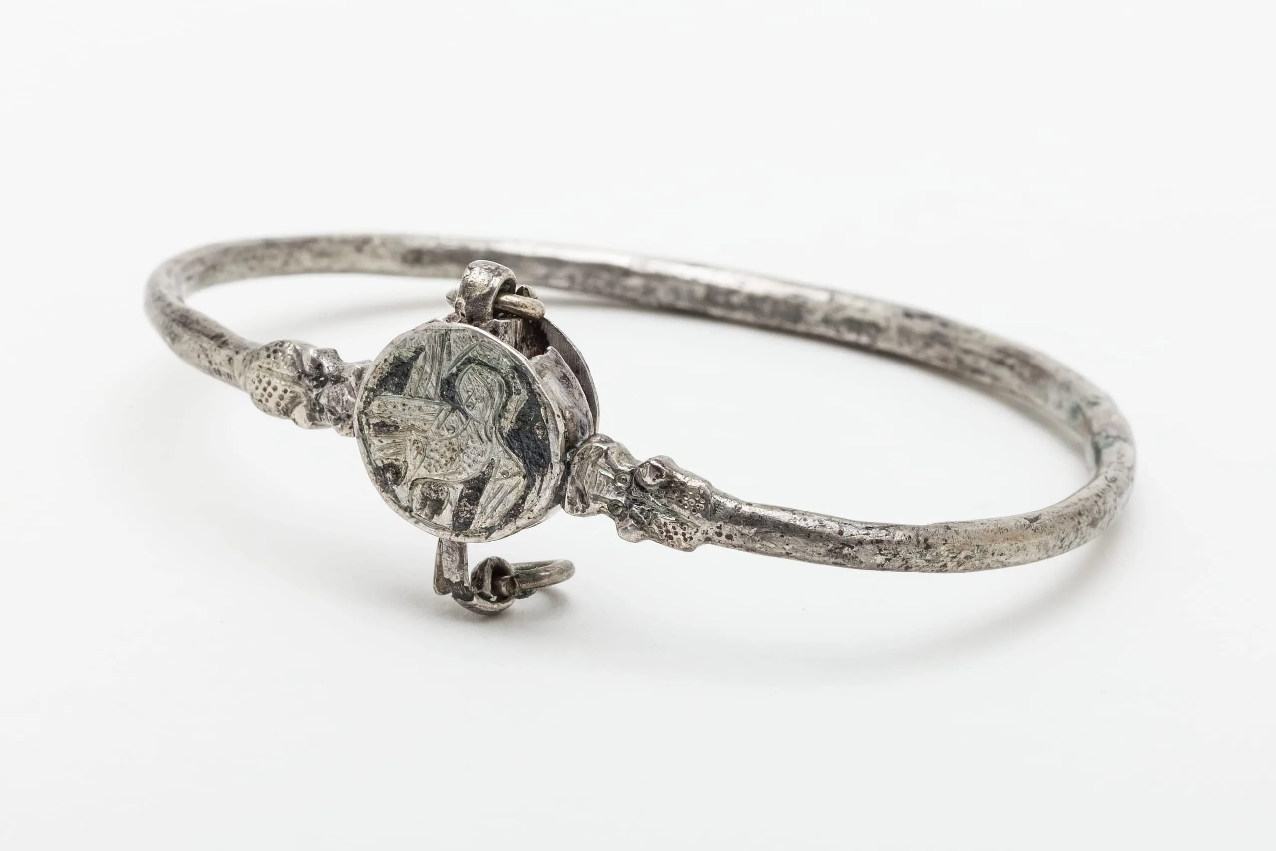 The human-headed bird, known from classical mythology as a harpy, was a common motif in Greco-Roman and Sasanian Iranian art, which continued into the Islamic period. In Muslim scientific and literary manuscripts, the mythical creature is often associated with exotic lands and considered auspicious. As decoration for this child-size bracelet, it likely served as a symbol of protection.