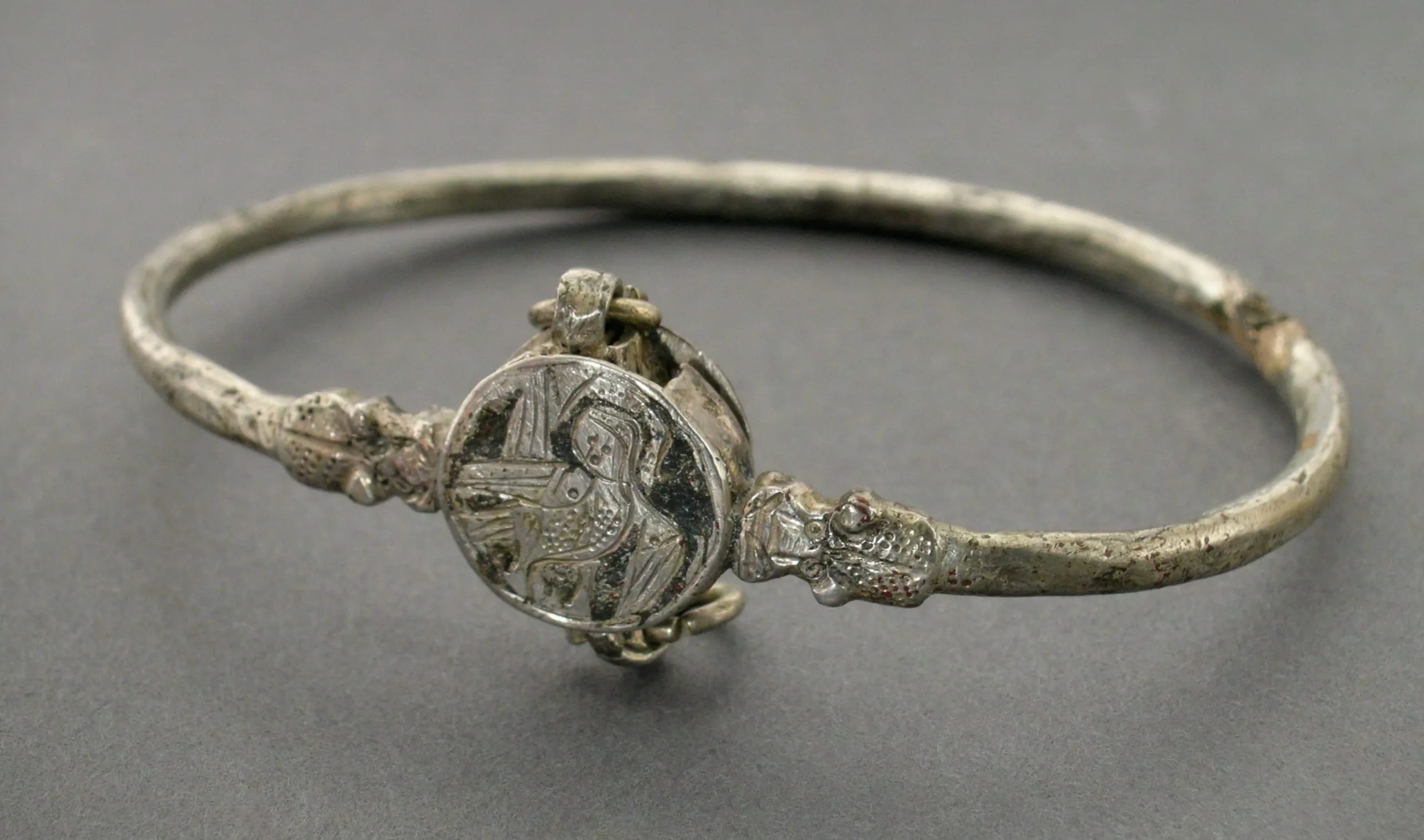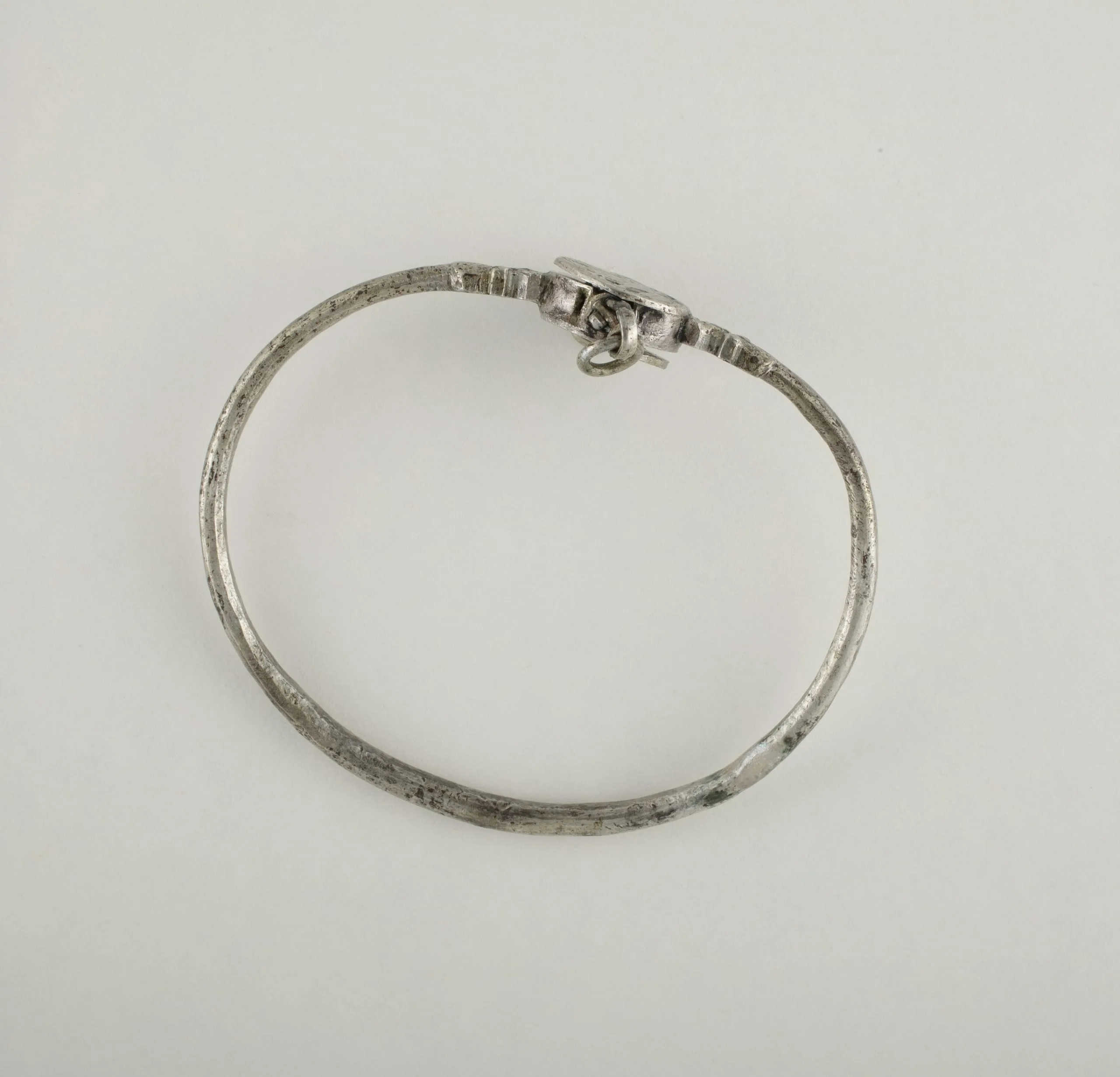 - Silver, fabricated from sheet and round wire, decorated with bitumen-highlighted incising