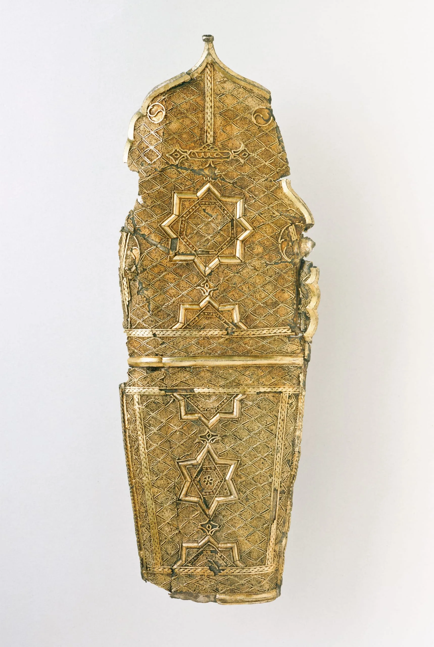The highly disciplined Janissary corps formed the sultan’s crack infantry troops. As a part of their uniform, the Janissaries wore a distinctive felt hat somewhat like a stocking cap in appearance (see M.85.237.42), to which was affixed just above the forehead an ornament such as this rare silver gilt example, which was perhaps reserved for officers. Slightly concave and decorated with delicately worked geometric designs, it probably represents an abstract version of the wooden "spoon" worn by the ordinary Jannissary as an insignia demonstrating his loyalty to the sultan—signifying that it was the ruler who provided him with his daily soup.