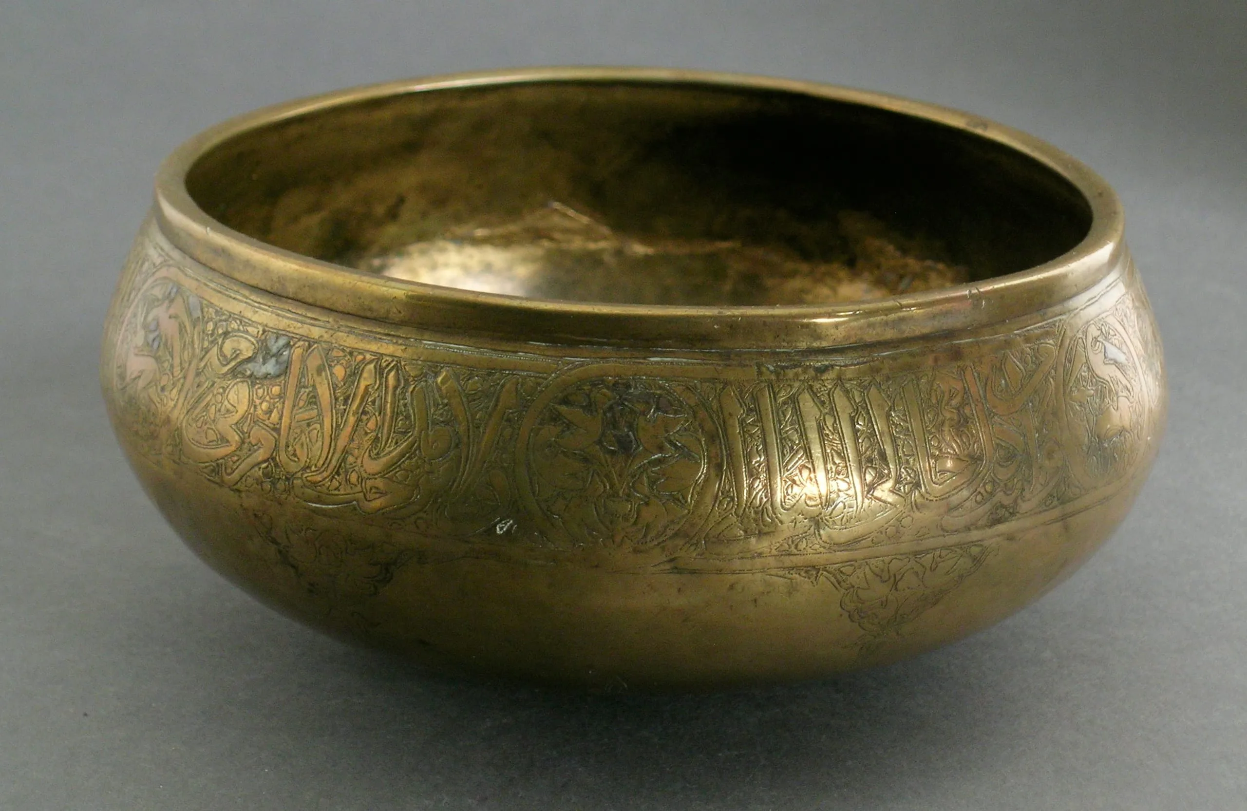 Brass bowl with squat rounded form, encircled by a wide band of engraved Arabic calligraphy and scrolling floral motifs on a burnished golden surface
