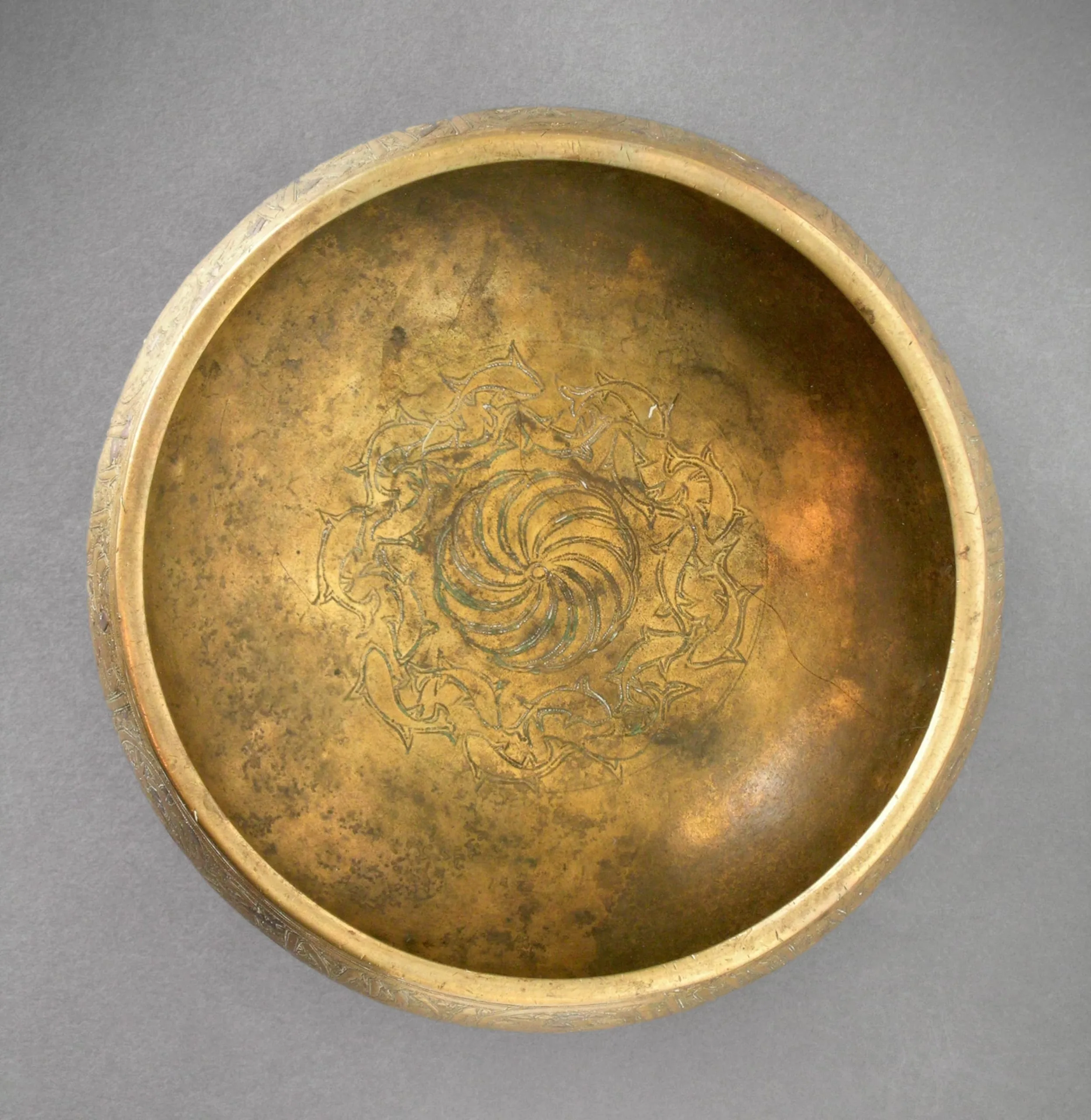 Brass bowl viewed from above, with engraved spiral motif at center surrounded by radiating foliate or flame-like patterns; aged golden surface with green patina and incised decoration along the rim.