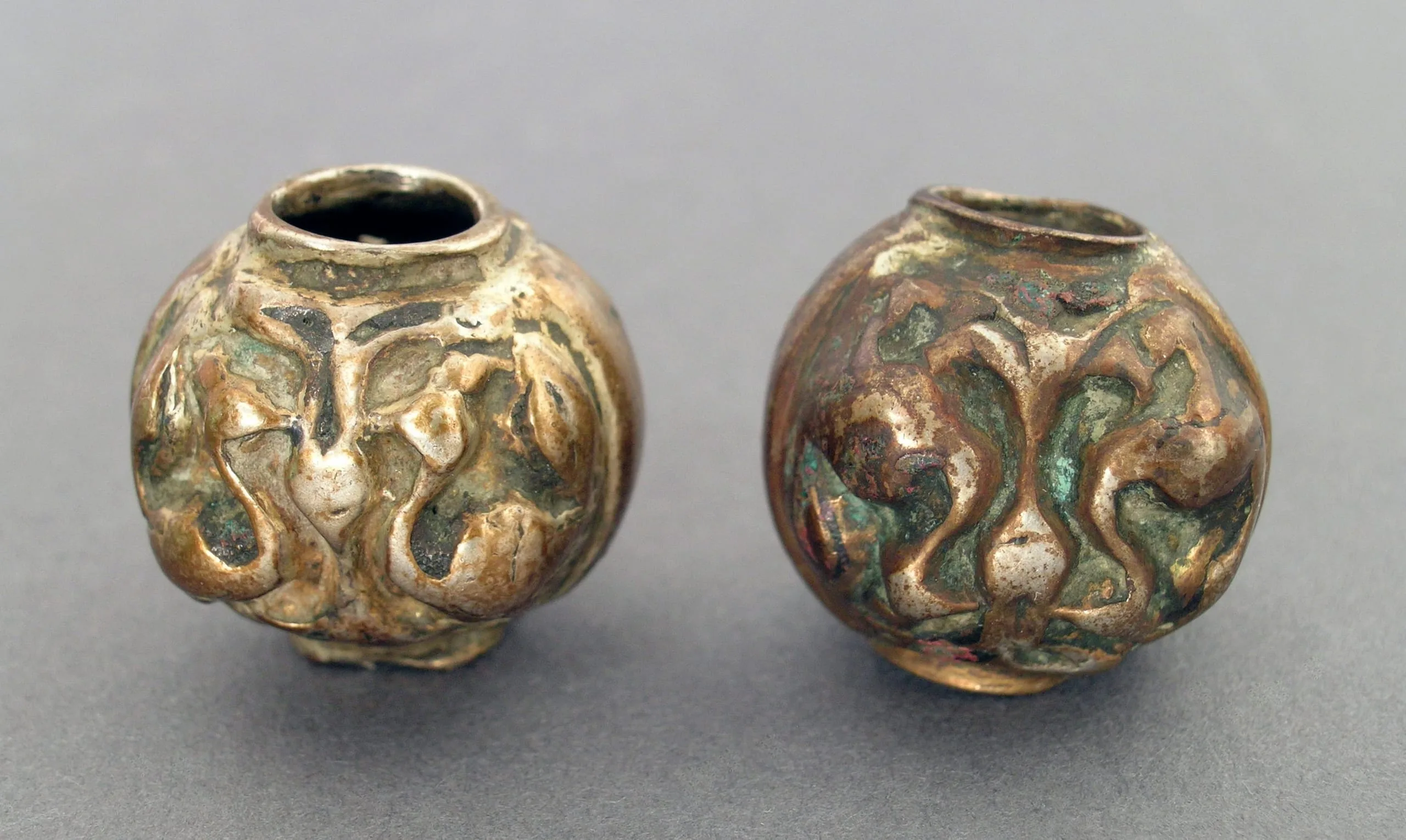 - Silver, cast in two halves, decorated with gilding, and niello inlay