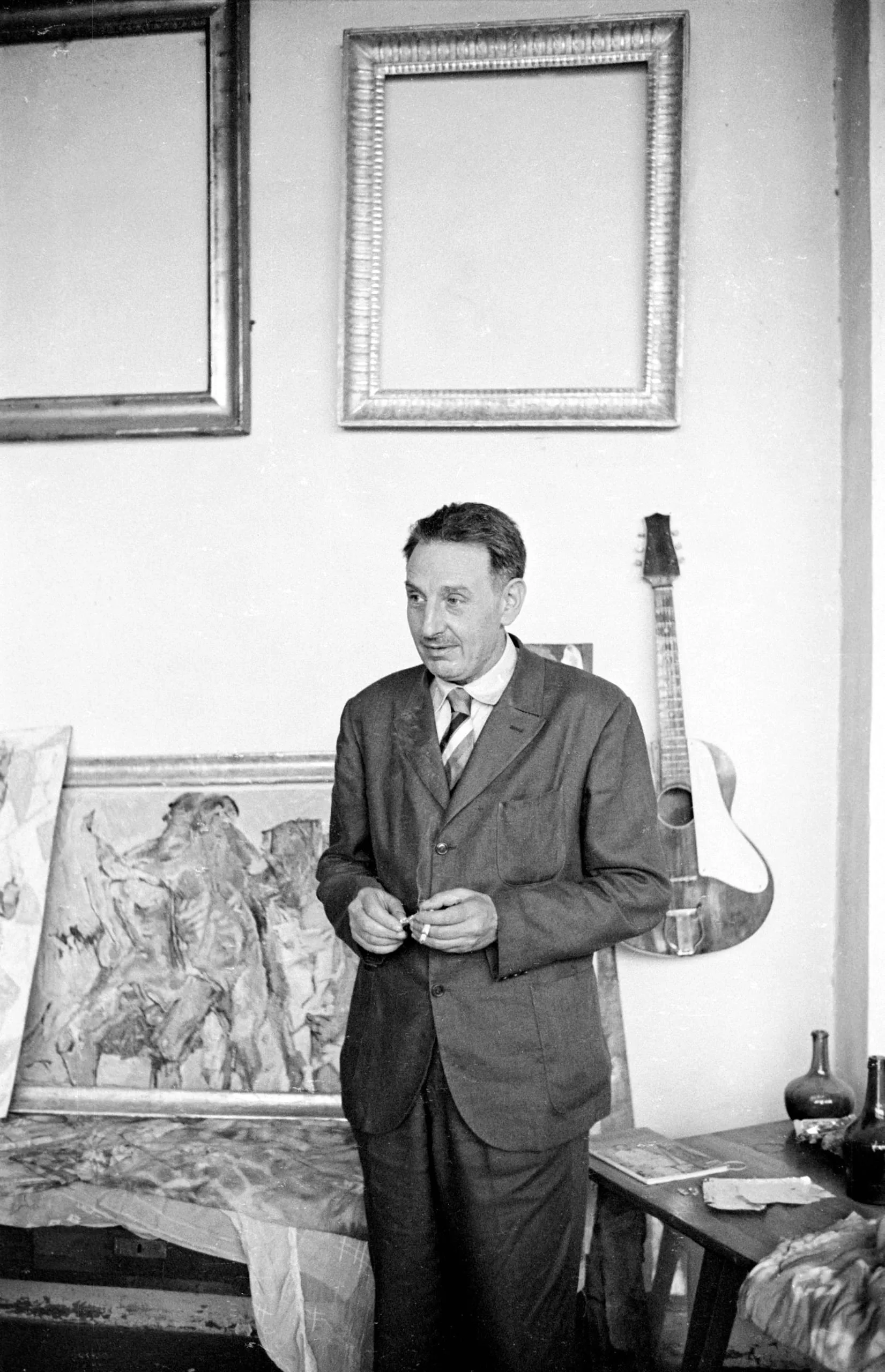Black and white photograph of a man in a suit standing in an artist's studio, with an unframed painting and a guitar visible behind him