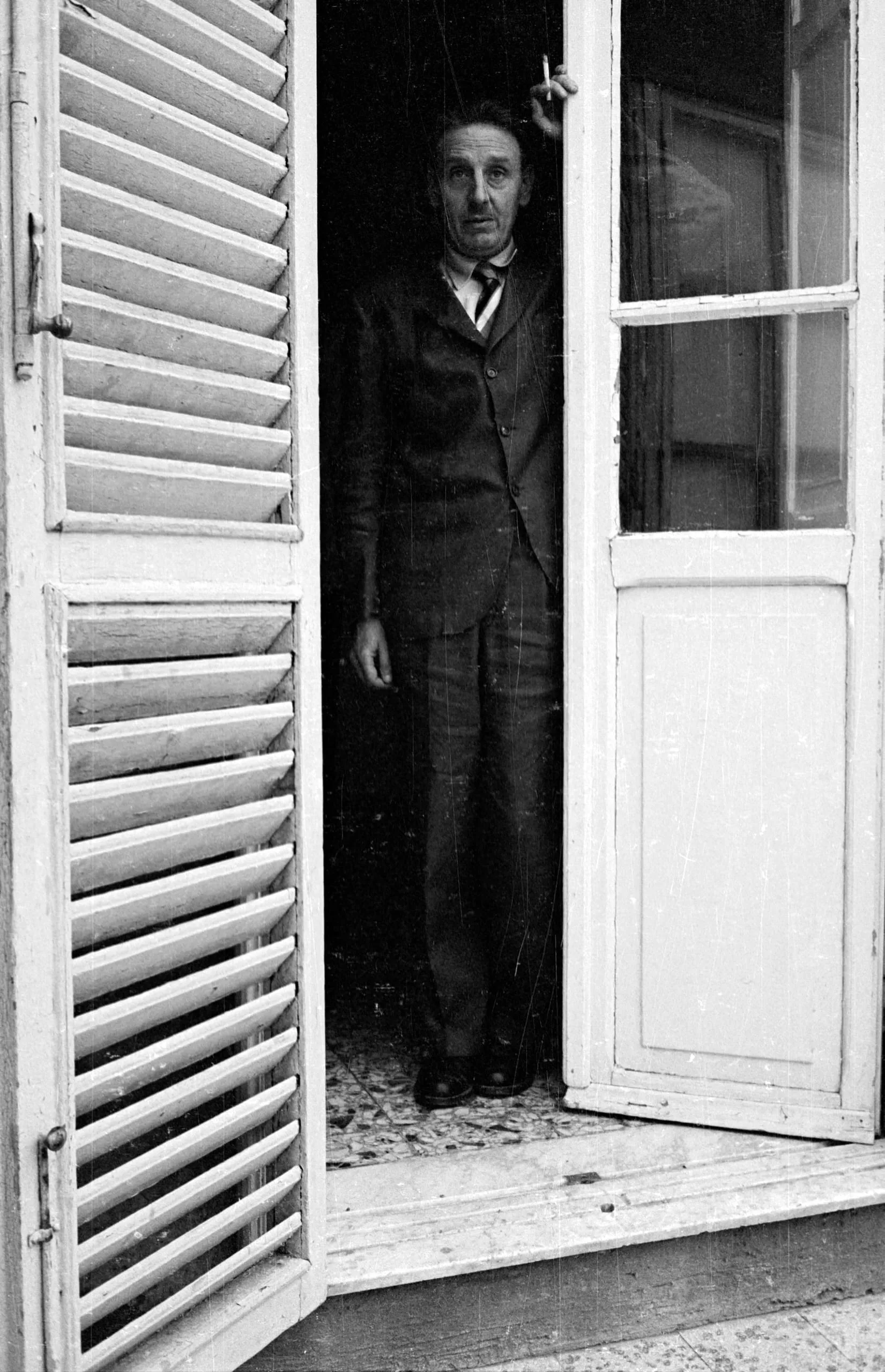 Black and white photograph of a man in a dark suit standing in an open doorway flanked by white louvered shutters, holding a cigarette above his head
