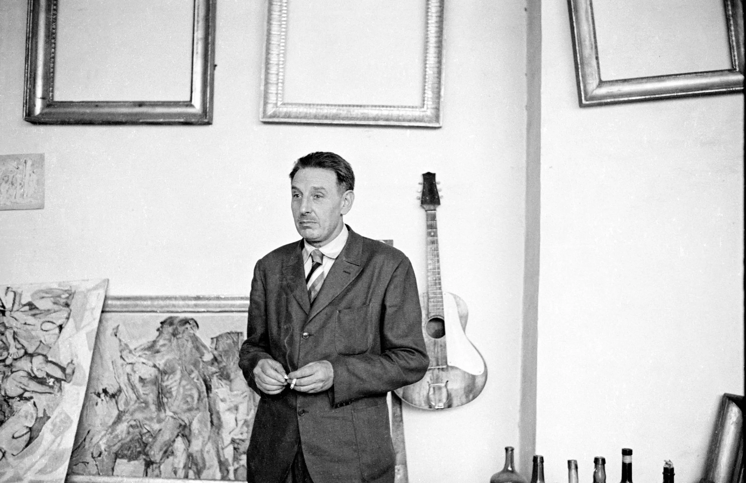 Black and white photograph of a white man in a dark suit standing in a room with empty gilt frames, a hanging guitar, and large paintings leaning against the wall