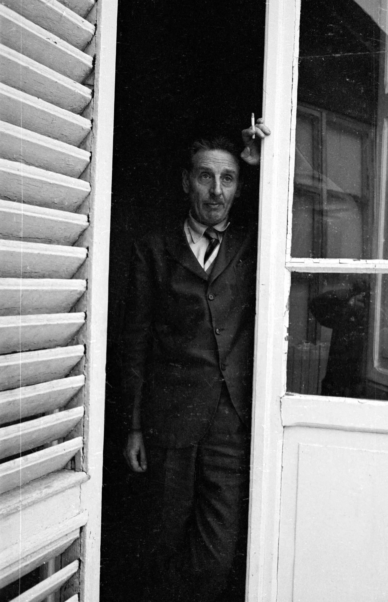 Black and white photograph of a thin white man in a dark three-piece suit standing in an open doorway, holding a cigarette above his head, louvered shutters to the left