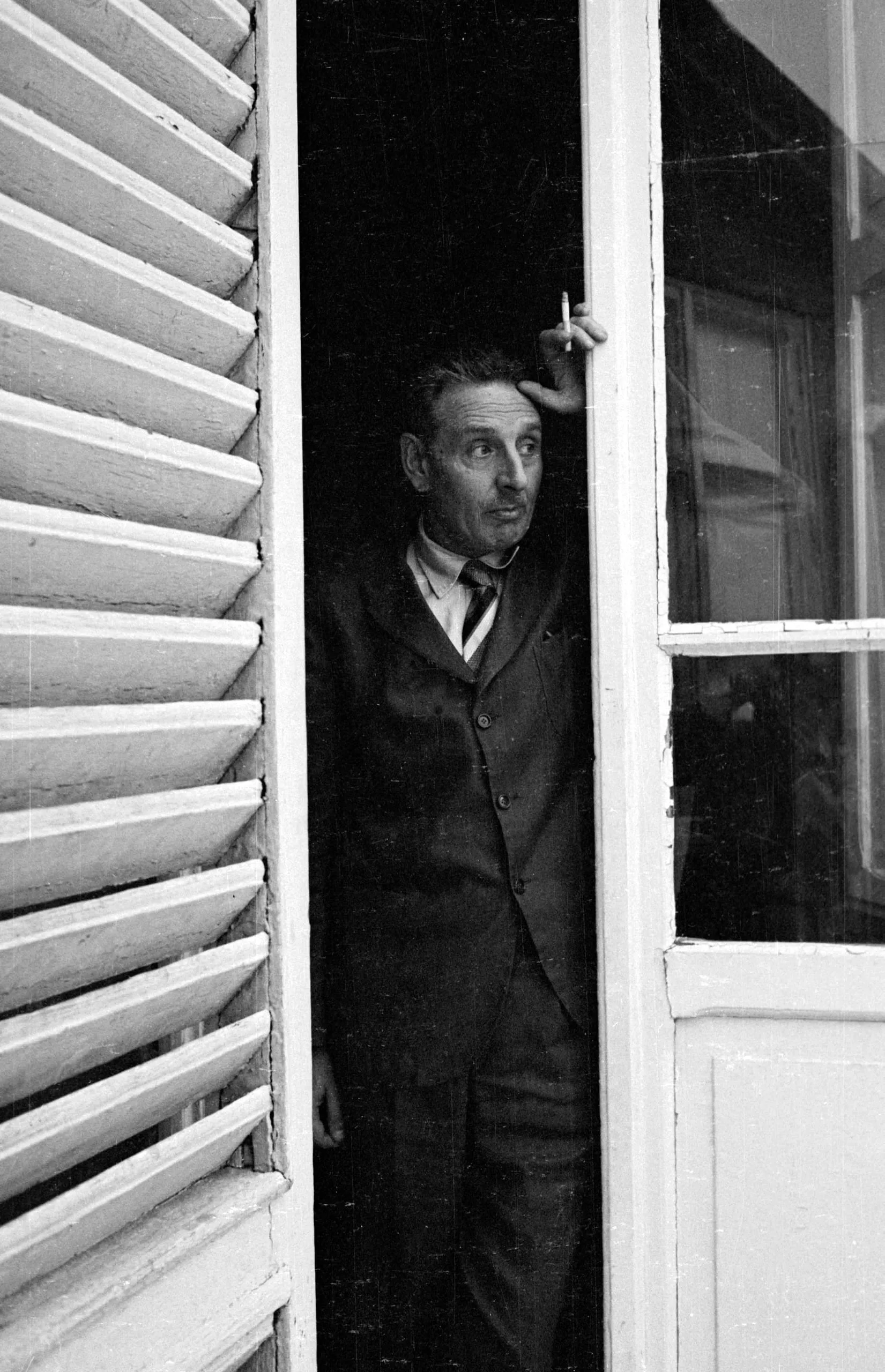 Black and white photograph of a man in a dark three-piece suit standing in a doorway between louvered shutters, holding a cigarette, looking upward