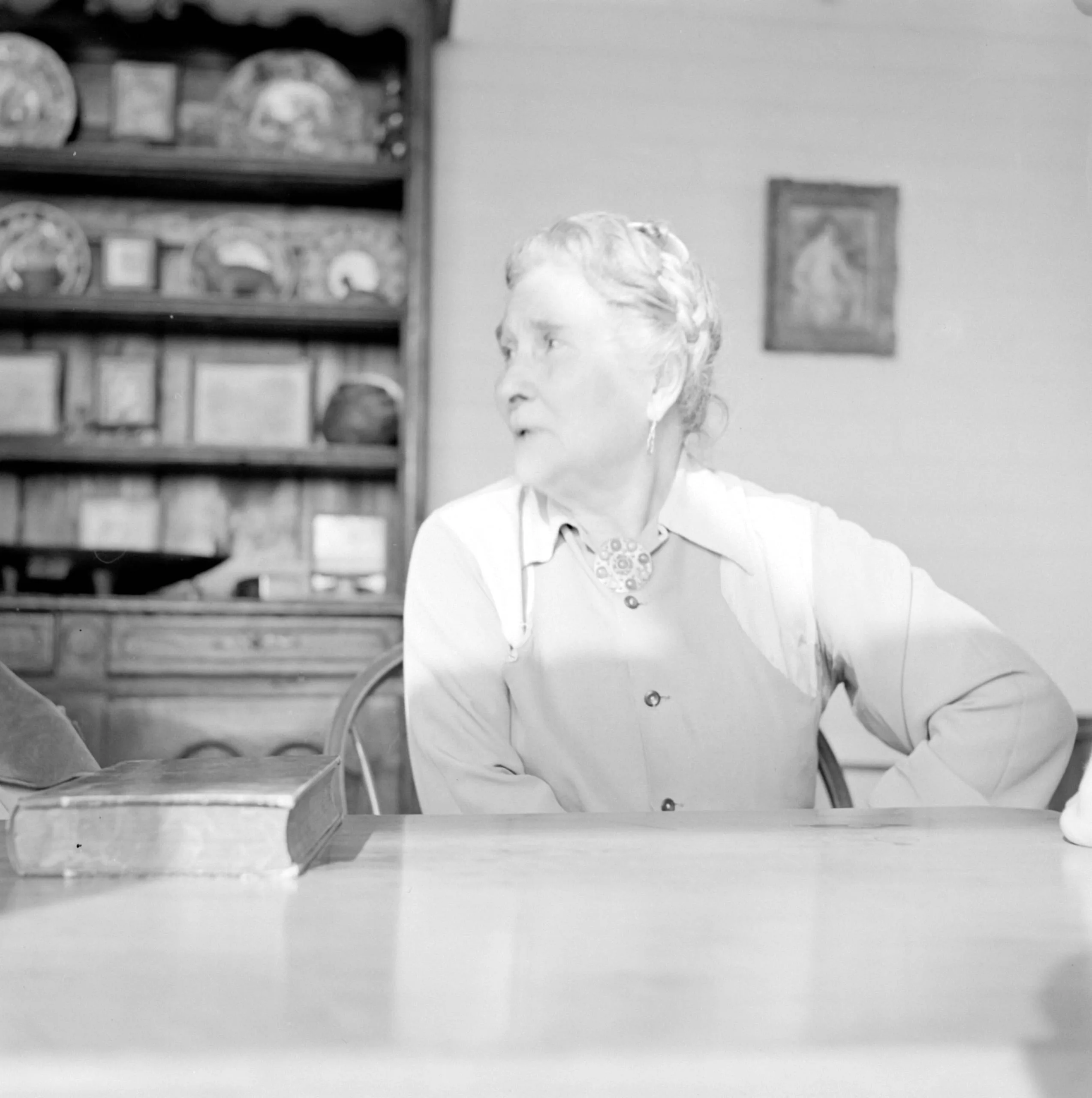Black and white photograph of an older white woman with braided gray hair, seated at a table, turning to her left with lips slightly parted, wearing a button-down blouse and cluster necklace