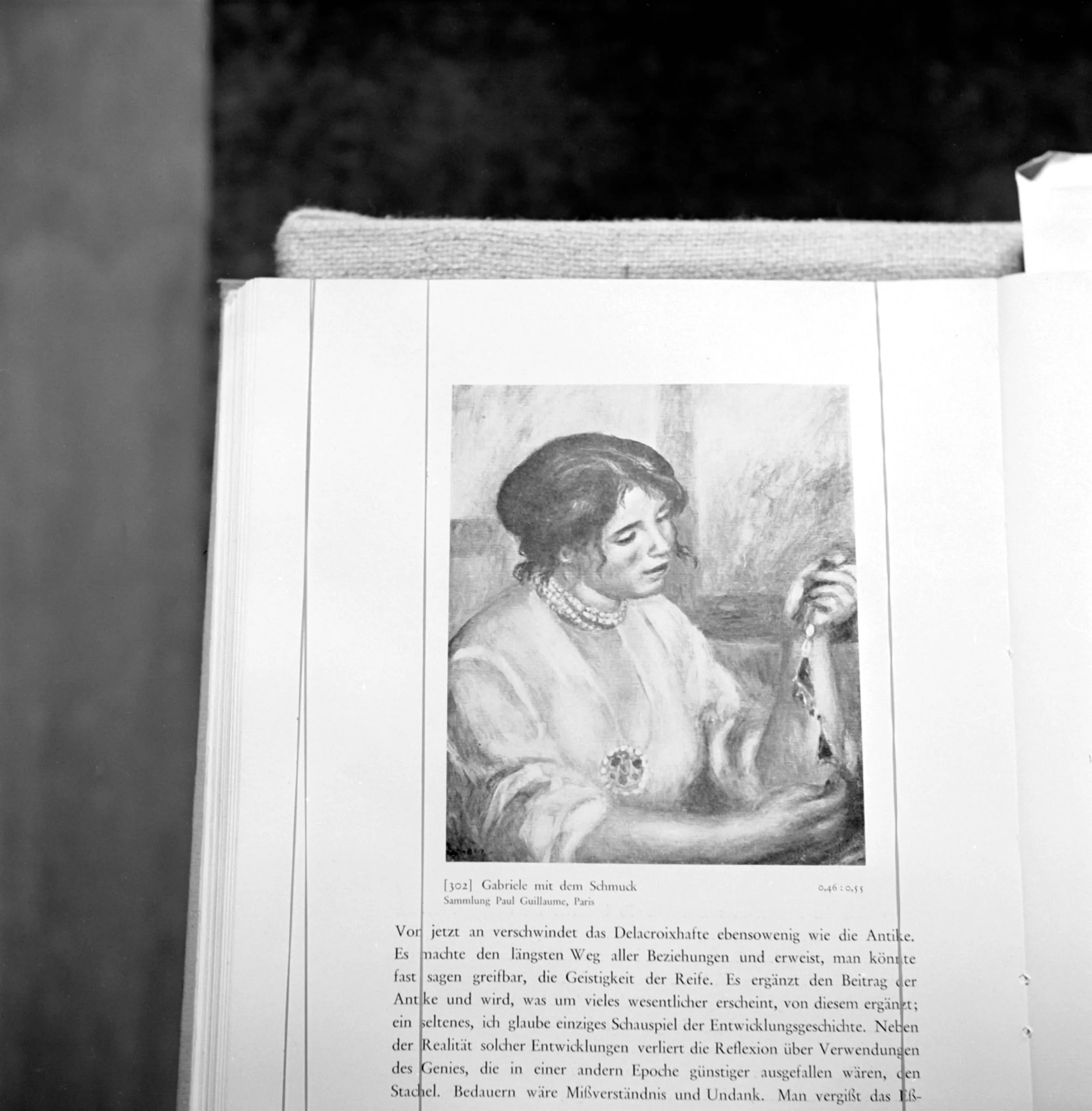 Black and white photograph of an open book displaying a printed Impressionist painting reproduction of a seated woman holding jewelry, with German caption and text below